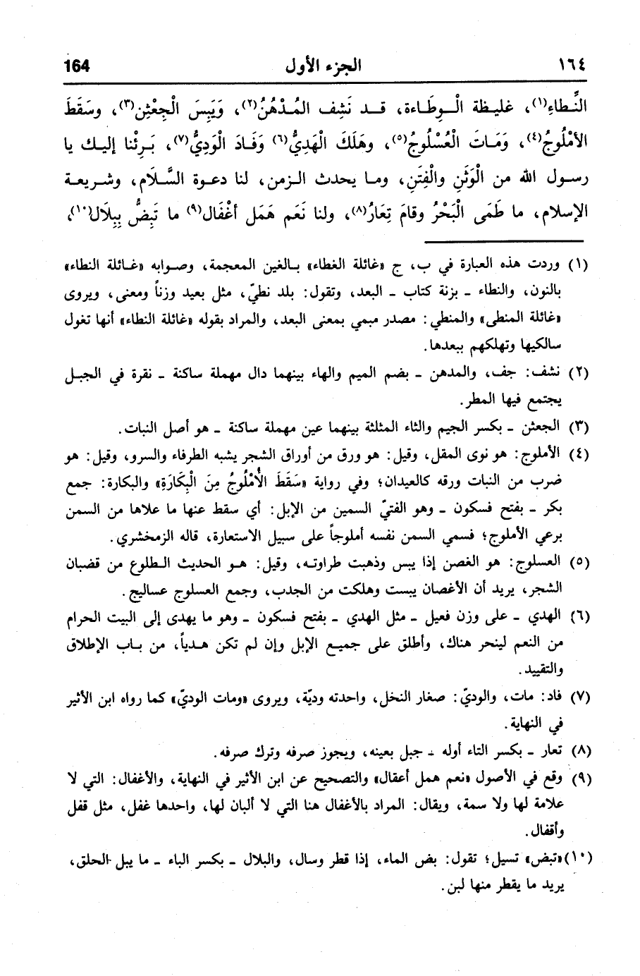 النّطاء «1» ، غليظة الوطاءة، قد نشف المدهن «2» ، ويبس الجعثن «3» ، وسقط الأملوج «4» ، ومات العسلوج «5» ، وهلك الهديّ «6» وفاد الوديّ «7» ، برئنا إليك يا رسول الله من الوثن والفتن، وما يحدث الزمن، لنا دعوة السّلام، وشريعة الإسلام، ما طمى البحر وقام تعار «8» ، ولنا نعم همل أغفال «9» ما تبضّ ببلال «10» ،