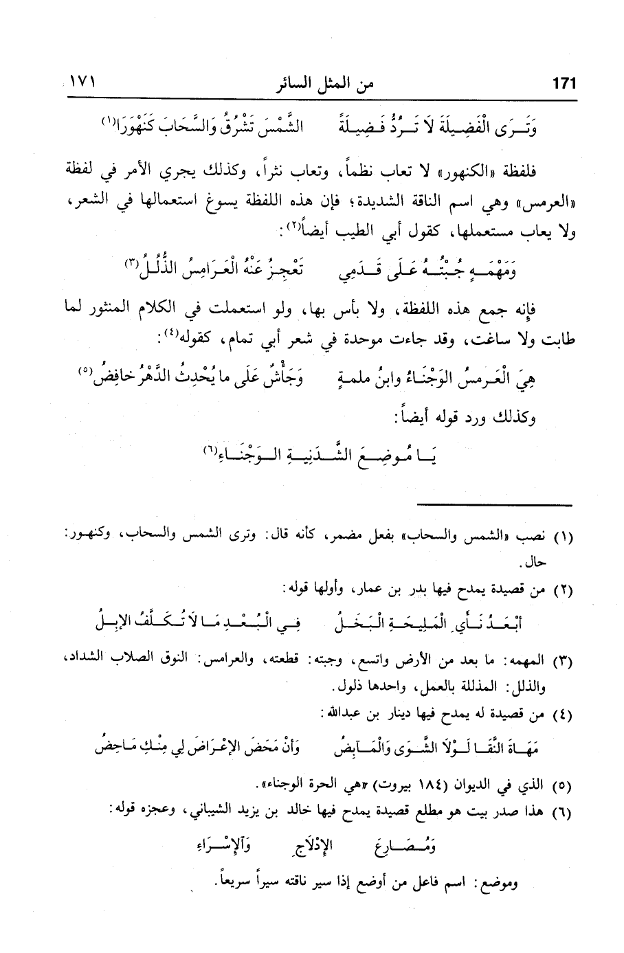 فلفظة «الكنهور» لا تعاب نظما، وتعاب نثرا، وكذلك يجري الأمر في لفظة «العرمس» وهي اسم الناقة الشديدة؛ فإن هذه اللفظة يسوغ استعمالها في الشعر، ولا يعاب مستعملها، كقول أبي الطيب أيضا «2» :