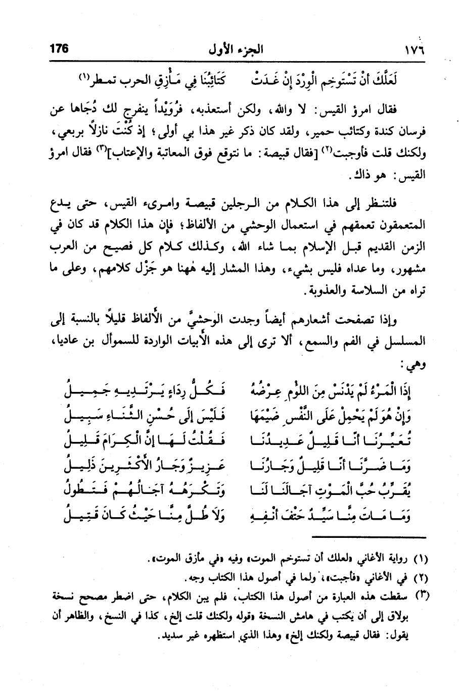 فلتنظر إلى هذا الكلام من الرجلين قبيصة وامرئ القيس، حتى يدع المتعمقون تعمقهم في استعمال الوحشي من الألفاظ؛ فإن هذا الكلام قد كان في الزمن القديم قبل الإسلام بما شاء الله، وكذلك كلام كل فصيح من العرب مشهور، وما عداه فليس بشيء، وهذا المشار إليه ههنا هو جزل كلامهم، وعلى ما تراه من السلاسة والعذوبة.