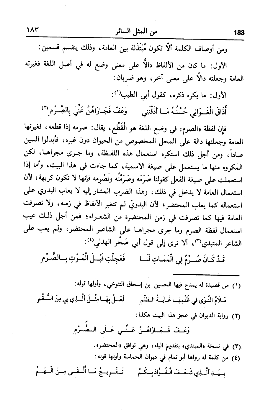 فإن لفظة «الصرم» في وضع اللغة هو القطع، يقال: صرمه إذا قطعه، فغيرتها العامة وجعلتها دالة على المحل المخصوص من الحيوان دون غيره، فأبدلوا السين صادا، ومن أجل ذلك استكره استعمال هذه اللفظة، وما جرى مجراها، لكن المكروه منها ما يستعمل على صيغة الاسمية، كما جاءت في هذا البيت، وأما إذا استعملت على صيغة الفعل كقولنا صرمه وصرمته وتصرمه فإنها لا تكون كريهة؛ لأن استعمال العامة لا يدخل في ذلك، وهذا الضرب المشار إليه لا يعاب البدوي على استعماله كما يعاب المحتضر؛ لأن البدويّ لم تتغير الألفاظ في زمنه، ولا تصرفت العامة فيها كما تصرفت في زمن المحتضرة من الشعراء؛ فمن أجل ذلك عيب استعمال لفظة الصرم وما جرى مجراها على الشاعر المحتضر، ولم يعب على الشاعر المتبدي «3» ، ألا ترى إلى قول أبي صخر الهذلي «4» :