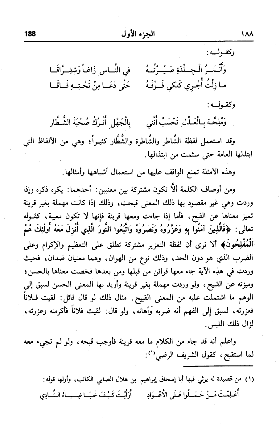 ومن أوصاف الكلمة ألّا تكون مشتركة بين معنيين: أحدهما: يكره ذكره وإذا وردت وهي غير مقصود بها ذلك المعنى قبحت، وذلك إذا كانت مهملة بغير قرينة تميز معناها عن القبح، فأما إذا جاءت ومعها قرينة فإنها لا تكون معيبة، كقوله تعالى: فالذين آمنوا به وعزروه ونصروه واتبعوا النور الذي أنزل معه أولئك هم المفلحون