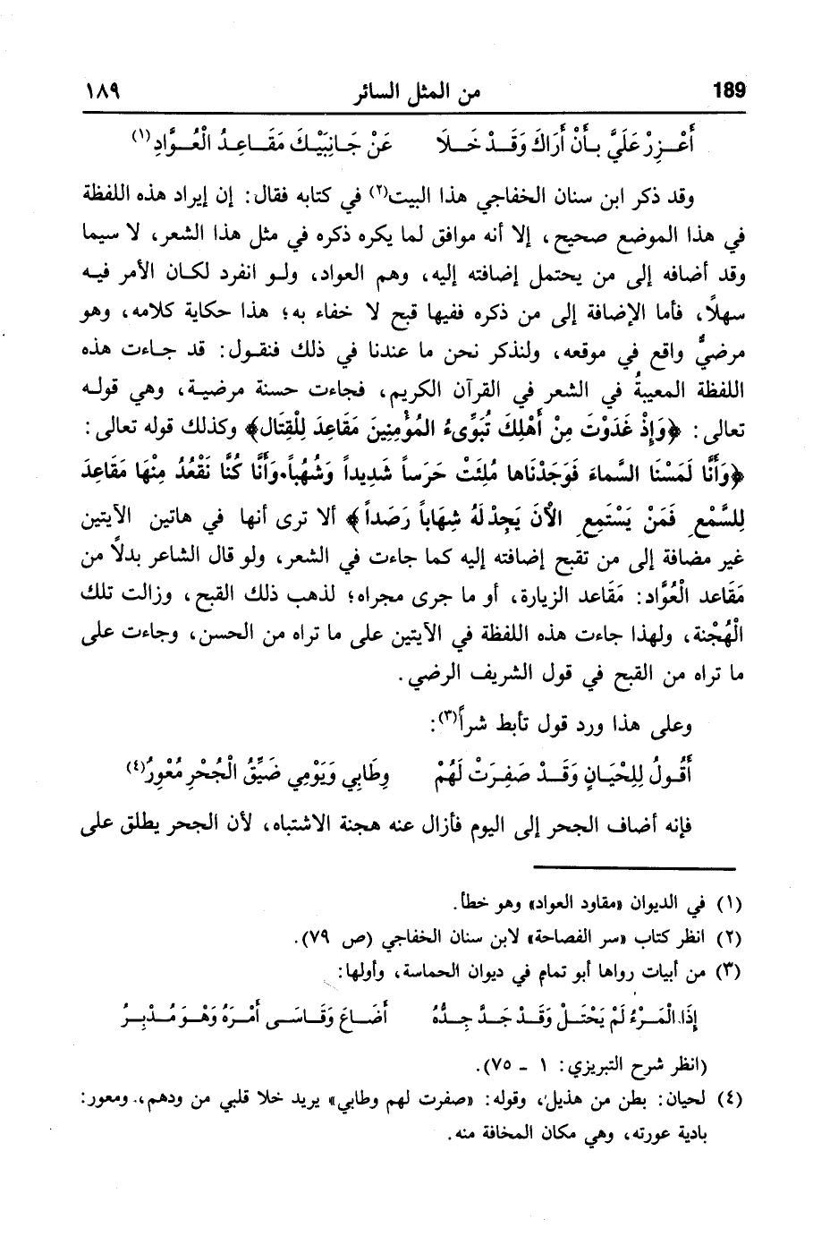 وقد ذكر ابن سنان الخفاجي هذا البيت «2» في كتابه فقال: إن إيراد هذه اللفظة في هذا الموضع صحيح، إلا أنه موافق لما يكره ذكره في مثل هذا الشعر، لا سيما وقد أضافه إلى من يحتمل إضافته إليه، وهم العواد، ولو انفرد لكان الأمر فيه سهلا، فأما الإضافة إلى من ذكره ففيها قبح لا خفاء به؛ هذا حكاية كلامه، وهو مرضيّ واقع في موقعه، ولنذكر نحن ما عندنا في ذلك فنقول: قد جاءت هذه اللفظة المعيبة في الشعر في القرآن الكريم، فجاءت حسنة مرضية، وهي قوله تعالى: وإذ غدوت من أهلك تبوئ المؤمنين مقاعد للقتال