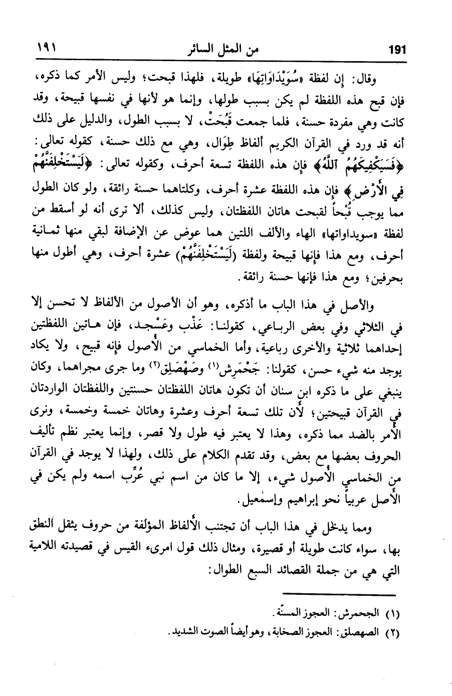 والأصل في هذا الباب ما أذكره، وهو أن الأصول من الألفاظ لا تحسن إلا في الثلاثي وفي بعض الرباعي، كقولنا: عذب وعسجد، فإن هاتين اللفظتين إحداهما ثلاثية والأخرى رباعية، وأما الخماسي من الأصول فإنه قبيح، ولا يكاد يوجد منه شيء حسن، كقولنا: جحمرش «1» وصهصلق «2» وما جرى مجراهما، وكان ينبغي على ما ذكره ابن سنان أن تكون هاتان اللفظتان حسنتين واللفظتان الواردتان في القرآن قبيحتين؛ لأن تلك تسعة أحرف وعشرة وهاتان خمسة وخمسة، ونرى الأمر بالضد مما ذكره، وهذا لا يعتبر فيه طول ولا قصر، وإنما يعتبر نظم تأليف الحروف بعضها مع بعض، وقد تقدم الكلام على ذلك، ولهذا لا يوجد في القرآن من الخماسي الأصول شيء، إلا ما كان من اسم نبي عرّب اسمه ولم يكن في الأصل عربيا نحو إبراهيم وإسمعيل.