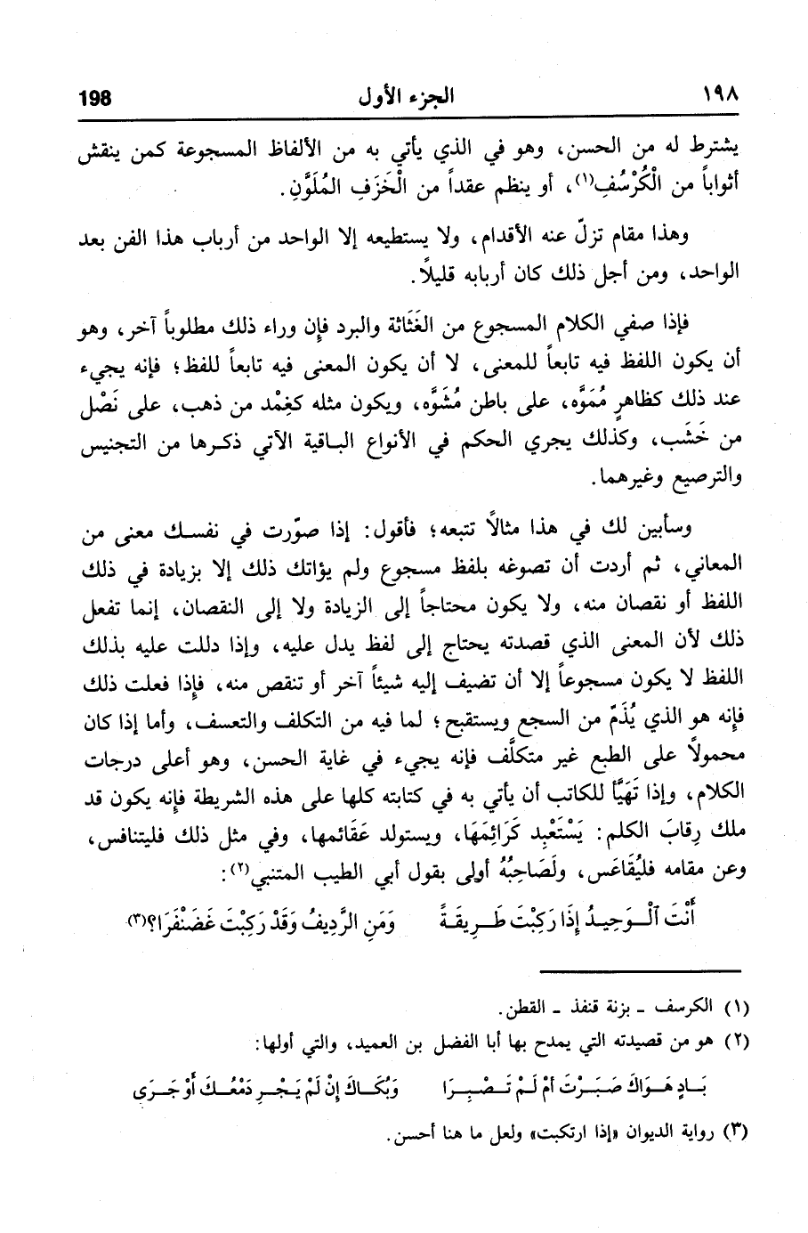 وسأبين لك في هذا مثالا تتبعه؛ فأقول: إذا صوّرت في نفسك معنى من المعاني، ثم أردت أن تصوغه بلفظ مسجوع ولم يؤاتك ذلك إلا بزيادة في ذلك اللفظ أو نقصان منه، ولا يكون محتاجا إلى الزيادة ولا إلى النقصان، إنما تفعل ذلك لأن المعنى الذي قصدته يحتاج إلى لفظ يدل عليه، وإذا دللت عليه بذلك اللفظ لا يكون مسجوعا إلا أن تضيف إليه شيئا آخر أو تنقص منه، فإذا فعلت ذلك فإنه هو الذي يذمّ من السجع ويستقبح؛ لما فيه من التكلف والتعسف، وأما إذا كان محمولا على الطبع غير متكلّف فإنه يجيء في غاية الحسن، وهو أعلى درجات الكلام، وإذا تهيّأ للكتاب أن يأتي به في كتابته كلها على هذه الشريطة فإنه يكون قد ملك رقاب الكلم: يستعبد كرائمها، ويستولد عقائمها، وفي مثل ذلك فليتنافس، وعن مقامه فليقاعس، ولصاحبه أولى بقول أبي الطيب المتنبي «2» :