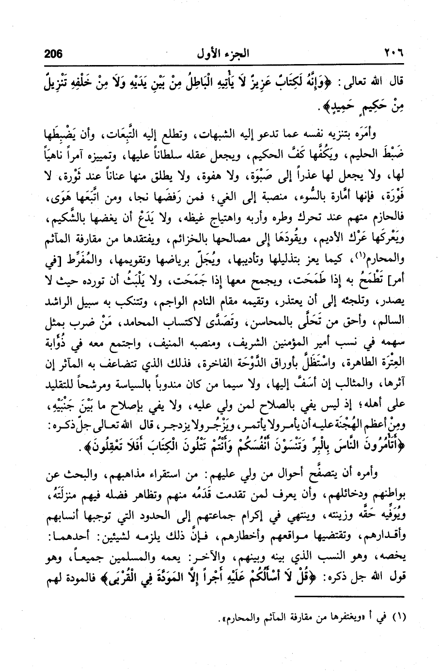 وأمره بتنزيه نفسه عما تدعو إليه الشبهات، وتطلع إليه التّبعات، وأن يضبطها ضبط الحليم، ويكفّها كفّ الحكيم، ويجعل عقله سلطانا عليها، وتمييزه آمرا ناهيا لها، ولا يجعل لها عذرا إلى صبوة، ولا هفوة، ولا يطلق منها عنانا عند ثورة، لا فورة، فإنها أمّارة بالسّوء، منصبة إلى الغي؛ فمن رفضها نجا، ومن اتّبعها هوى، فالحازم متهم عند تحرك وطره وأربه واهتياج غيظه، ولا يدع أن يغضها بالشّكيم، ويعركها عرك الأديم، ويقودها إلى مصالحها بالخزائم، ويفتقدها من مقارفة المآثم والمحارم «1» ، كيما يعز بتذليلها وتأديبها، ويجلّ برياضها وتقويمها، والمفرّط [في أمر] تطمح به إذا طمحت، ويجمح معها إذا جمحت، ولا يلبث أن تورده حيث لا يصدر، وتلجئه إلى أن يعتذر، وتقيمه مقام النادم الواجم، وتتنكب به سبيل الراشد السالم، وأحق من تحلّى بالمحاسن، وتصدّى لاكتساب المحامد، من ضرب بمثل سهمه في نسب أمير المؤمنين الشريف، ومنصبه المنيف، واجتمع معه في ذؤابة العترة الطاهرة، واستظلّ بأوراق الدّوحة الفاخرة، فذلك الذي تتضاعف به المآثر إن آثرها، والمثالب إن أسفّ إليها، ولا سيما من كان مندوبا بالسياسة ومرشحا للتقليد على أهله؛ إذ ليس يفي بالصلاح لمن ولي عليه، ولا يفي بإصلاح ما بين جنبيه، ومن أعظم الهجنة عليه أن يأمر ولا يأتمر، ويزجر ولا يزدجر، قال الله تعالى جلّ ذكره: