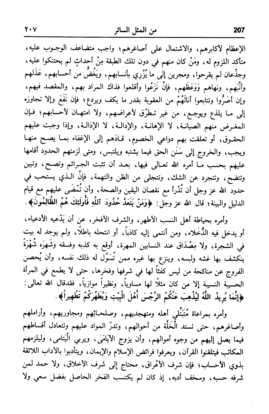 وأمره بمراعاة متبتّلي أهله ومتهجديهم، وصلحائهم ومجاوريهم، وأراملهم وأصاغرهم، حتى تستد الخلّة من أحوالهم، وتدرّ المواد عليهم وتتعادل أقساطهم فيما يصل إليهم من وجوه أموالهم، وأن يزوج الأيامى، ويربي اليتامى، وليلزمهم المكاتب فيتلقنوا القرآن، ويعرفوا فرائض الإسلام والإيمان، ويتأدبوا بالآداب اللائقة بذوي الأحساب؛ فإن شرف الأعراق، محتاج إلى شرف الأخلاق، ولا حمد لمن شرفه حسبه، وسخف أدبه، إذ كان لم يكتسب الفخر الحاصل بفضل سعي ولا