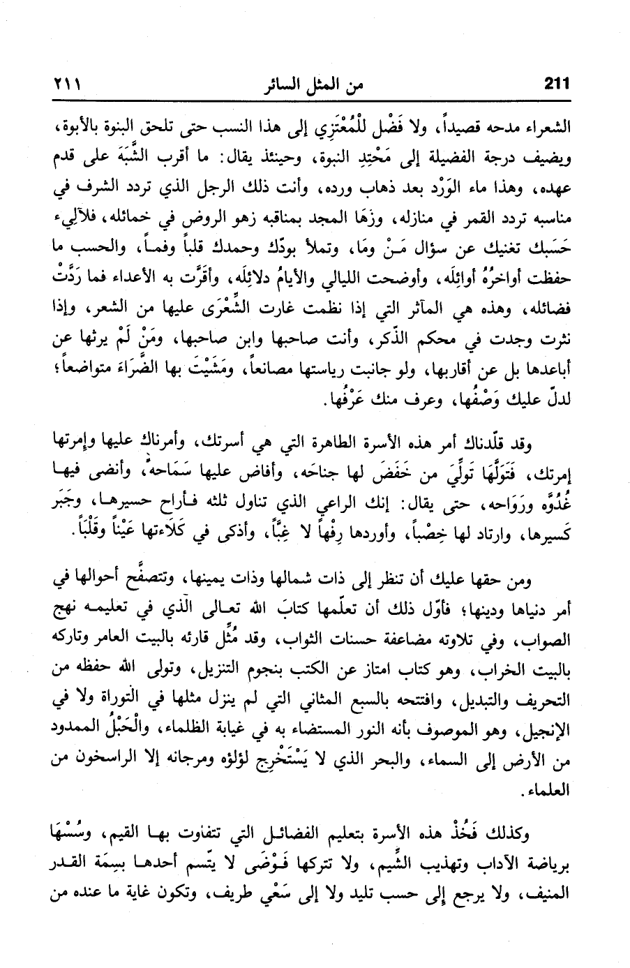 وكذلك فخذ هذه الأسرة بتعليم الفضائل التي تتفاوت بها القيم، وسسها برياضة الآداب وتهذيب الشّيم، ولا تتركها فوضى لا يتّسم أحدها بسمة القدر المنيف، ولا يرجع إلى حسب تليد ولا إلى سعي طريف، وتكون غاية ما عنده من