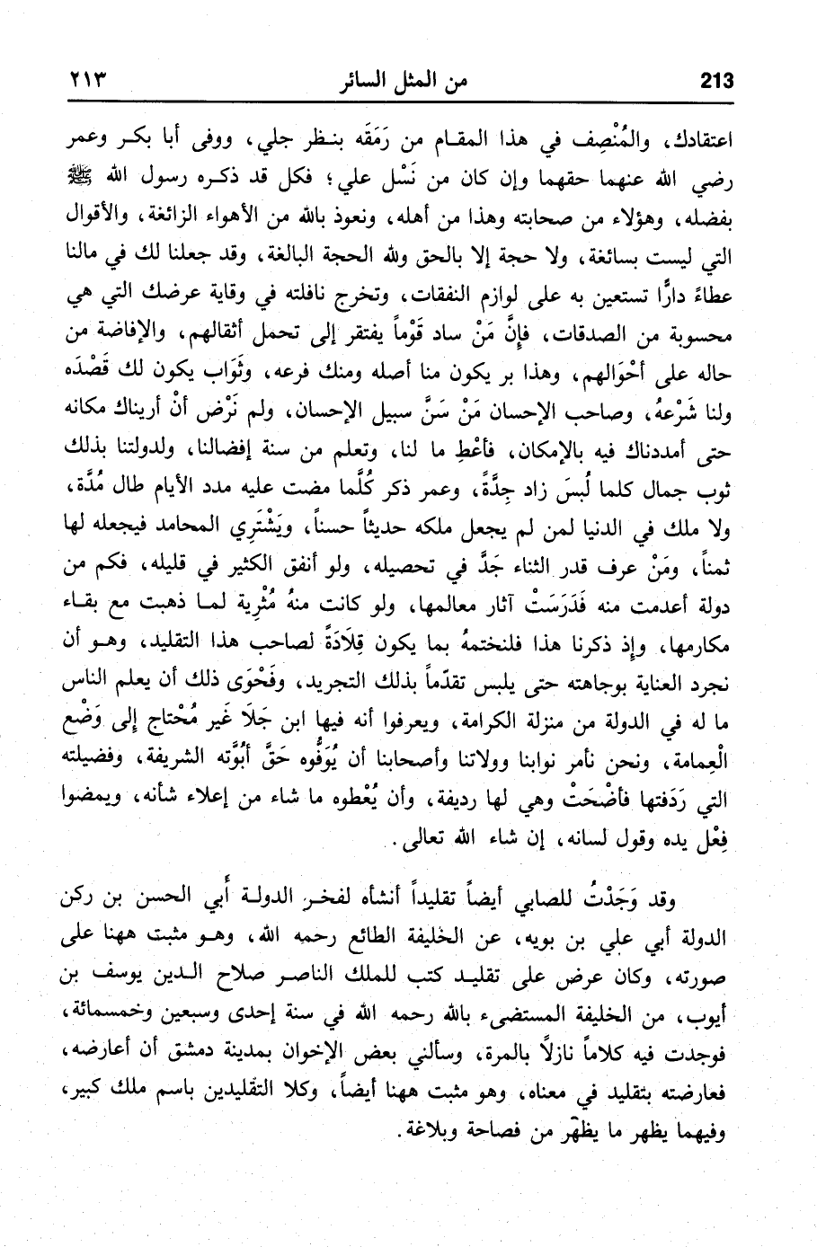 اعتقادك، والمنصف في هذا المقام من رمقه بنظر جلي، ووفى أبا بكر وعمر رضي الله عنهما حقهما وإن كان من نسل علي؛ فكل قد ذكره رسول الله صلّى الله عليه وسلّم بفضله، وهؤلاء من صحابته وهذا من أهله، ونعوذ بالله من الأهواء الزائغة، والأقوال التي ليست بسائغة، ولا حجة إلا بالحق ولله الحجة البالغة، وقد جعلنا لك في مالنا عطاء دارّا تستعين به على لوازم النفقات، وتخرج نافلته في وقاية عرضك التي هي محسوبة من الصدقات، فإنّ من ساد قوما يفتقر إلى تحمل أثقالهم، والإفاضة من حاله على أحوالهم، وهذا بر يكون منا أصله ومنك فرعه، وثواب يكون لك قصده ولنا شرعه، وصاحب الإحسان من سنّ سبيل الإحسان، ولم نرض أن أريناك مكانه حتى أمددناك فيه بالإمكان، فأعط ما لنا، وتعلم من سنة إفضالنا، ولدولتنا بذلك ثوب جمال كلما لبس زاد جدّة، وعمر ذكر كلّما مضت عليه مدد الأيام طال مدّة، ولا ملك في الدنيا لمن لم يجعل ملكه حديثا حسنا، ويشتري المحامد فيجعله لها ثمنا، ومن عرف قدر الثناء جدّ في تحصيله، ولو أنفق الكثير في قليله، فكم من دولة أعدمت منه فدرست آثار معالمها، ولو كانت منه مثرية لما ذهبت مع بقاء مكارمها، وإذ ذكرنا هذا فلنختمه بما يكون قلادة لصاحب هذا التقليد، وهو أن نجرد العناية بوجاهته حتى يلبس تقدّما بذلك التجريد، وفحوى ذلك أن يعلم الناس ما له في الدولة من منزلة الكرامة، ويعرفوا أنه فيها ابن جلا غير محتاج إلى وضع العمامة، ونحن نأمر نوابنا وولاتنا وأصحابنا أن يوفّوه حقّ أبوّته الشريفة، وفضيلته التي ردفتها فأضحت وهي لها رديفة، وأن يعطوه ما شاء من إعلاء شأنه، ويمضوا فعل يده وقول لسانه، إن شاء الله تعالى.