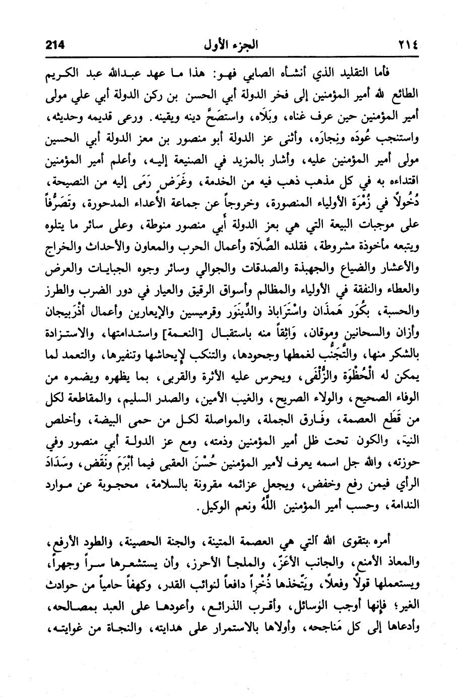 فأما التقليد الذي أنشأه الصابي فهو: هذا ما عهد عبد الله عبد الكريم الطائع لله أمير المؤمنين إلى فخر الدولة أبي الحسن بن ركن الدولة أبي علي مولى أمير المؤمنين حين عرف غناه، وبلاه، واستصحّ دينه ويقينه. ورعى قديمه وحديثه، واستنجب عوده ونجاره، وأثنى عز الدولة أبو منصور بن معز الدولة أبي الحسين مولى أمير المؤمنين عليه، وأشار بالمزيد في الصنيعة إليه، وأعلم أمير المؤمنين اقتداءه به في كل مذهب ذهب فيه من الخدمة، وغرض رمى إليه من النصيحة، دخولا في زمرة الأولياء المنصورة، وخروجا عن جماعة الأعداء المدحورة، وتصرّفا على موجبات البيعة التي هي بعز الدولة أبي منصور منوطة، وعلى سائر ما يتلوه ويتبعه مأخوذة مشروطة، فقلده الصّلاة وأعمال الحرب والمعاون والأحداث والخراج والأعشار والضياع والجهبذة والصدقات والجوالي وسائر وجوه الجبايات والعرض والعطاء والنفقة في الأولياء والمظالم وأسواق الرقيق والعيار في دور الضرب والطرز والحسبة، بكور همذان واستراباذ والدّينور وقرميسين والإيعارين وأعمال أذربيجان وأزان والسحانين وموقان، واثقا منه باستقبال [النعمة] واستدامتها، والاستزادة بالشكر منها، والتّجنّب لغمطها وجحودها، والتنكب لإيحاشها وتنفيرها، والتعمد لما يمكن له الحظوة والزّلفى، ويحرس عليه الأثرة والقربى، بما يظهره ويضمره من الوفاء الصحيح، والولاء الصريح، والغيب الأمين، والصدر السليم، والمقاطعة لكل من قطع العصمة، وفارق الجملة، والمواصلة لكل من حمى البيضة، وأخلص النية، والكون تحت ظل أمير المؤمنين وذمته، ومع عز الدولة أبي منصور وفي حوزته، والله جل اسمه يعرف لأمير المؤمنين حسن العقبى فيما أبرم ونقض، وسداد الرأي فيمن رفع وخفض، ويجعل عزائمه مقرونة بالسلامة، محجوبة عن موارد الندامة، وحسب أمير المؤمنين الله ونعم الوكيل.