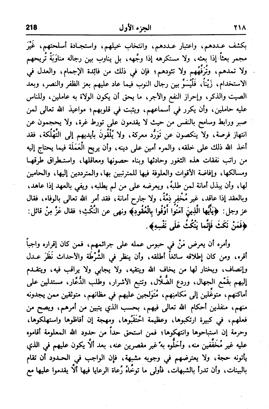 بكشف عددهم، واعتبار عددهم، وانتخاب خيلهم، واستجادة أسلحتهم، غير مجمر بعثا إذا بعثه، ولا مستكرهه إذا وجّهه، بل يناوب بين رجاله مناوبة تريحهم ولا تمدهم، وترفّههم ولا تئودهم؛ فإن في ذلك من فائدة الإجمام، والعدل في الاستخدام، زينا، فليسوّبين رجال النوب فيما عاد عليهم بعز الظفر والنصر، وبعد الصيت والذكر، وإحراز النفع والأجر، ما يحق أن يكون الولاة به عاملين، وللناس عليه حاملين، وأن يكرر في أسماعهم، ويثبت في قلوبهم؛ مواعيد الله تعالى لمن صبر ورابط وسامح بالنفس من حيث لا يقدمون على تورط غرة، ولا يحجمون عن انتهاز فرصة، ولا ينكصون عن تورّد معركة، ولا يلقون بأيديهم إلى التّهلكة، فقد أخذ الله ذلك على خلقه، والمرء أمين على دينه، وأن يريح العملة فيما يحتاج إليه من راتب نفقات هذه الثغور وحادثها وبناء حصونها ومعاقلها، واستطراق طرقها ومسالكها، وإفاضة الأقوات والعلوفة فيها للمترتبين بها، والمترددين إليها، والحامين لها، وأن يبذل أمانة لمن طلبه، ويعرضه على من لم يطلبه، ويفي بالعهد إذا عاهد، وبالعقد إذا عاقد، غير مخفر ذمّة، ولا جارح أمانة، فقد أمر الله تعالى بالوفاء، فقال عز وجل: يا أيها الذين آمنوا أوفوا بالعقود