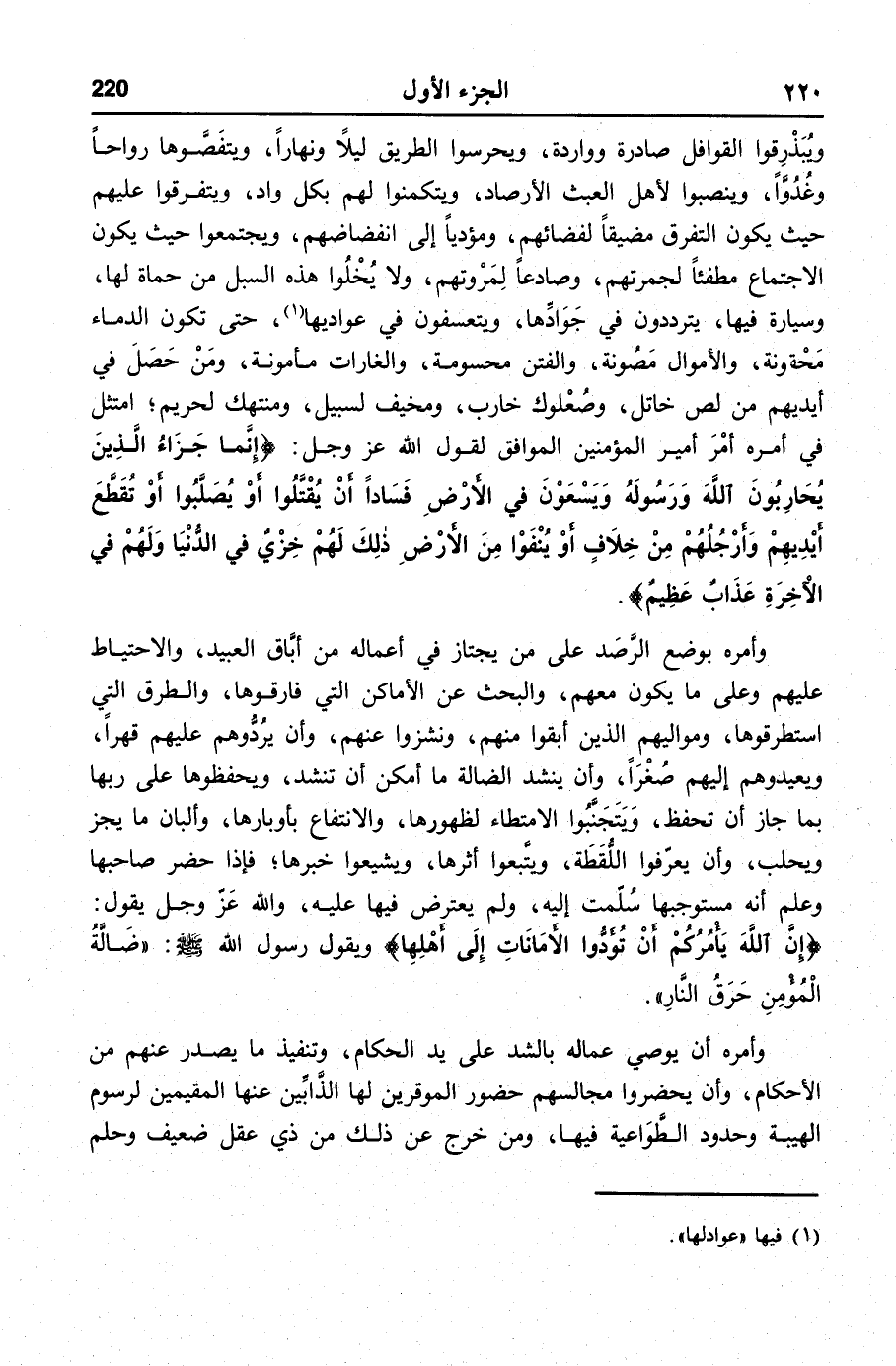 ويبذرقوا القوافل صادرة وواردة، ويحرسوا الطريق ليلا ونهارا، ويتفصّوها رواحا وغدوّا، وينصبوا لأهل العبث الأرصاد، ويتكمنوا لهم بكل واد، ويتفرقوا عليهم حيث يكون التفرق مضيقا لفضائهم، ومؤديا إلى انفضاضهم، ويجتمعوا حيث يكون الاجتماع مطفئا لجمرتهم، وصادعا لمروتهم، ولا يخلوا هذه السبل من حماة لها، وسيارة فيها، يترددون في جوادّها، ويتعسفون في عواديها «1» ، حتى تكون الدماء محقونة، والأموال مصونة، والفتن محسومة، والغارات مأمونة، ومن حصل في أيديهم من لص خاتل، وصعلوك خارب، ومخيف لسبيل، ومنتهك لحريم؛ امتثل في أمره أمر أمير المؤمنين الموافق لقول الله عز وجل: إنما جزاء الذين يحاربون الله ورسوله ويسعون في الأرض فسادا أن يقتلوا أو يصلبوا أو تقطع أيديهم وأرجلهم من خلاف أو ينفوا من الأرض ذلك لهم خزي في الدنيا ولهم في الآخرة عذاب عظيم.