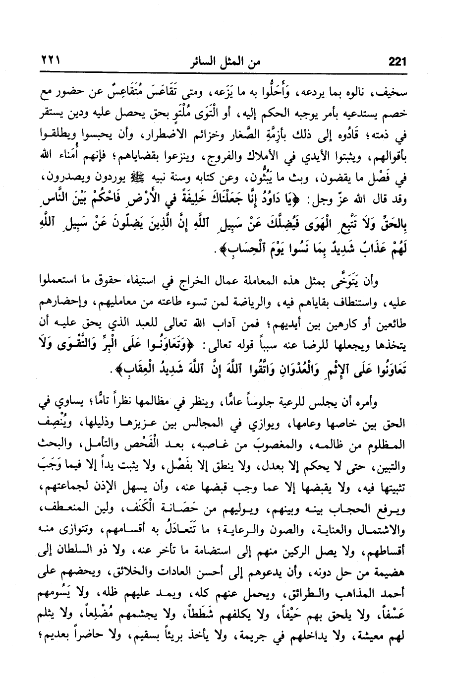 وأمره أن يجلس للرعية جلوسا عامّا، وينظر في مظالمها نظرا تامّا؛ يساوي في الحق بين خاصها وعامها، ويوازي في المجالس بين عزيزها وذليلها، وينصف المظلوم من ظالمه، والمغصوب من غاصبه، بعد الفحص والتأمل، والبحث والتبين، حتى لا يحكم إلا بعدل، ولا ينطق إلا بفصل، ولا يثبت يدا إلا فيما وجب تثبيتها فيه، ولا يقبضها إلا عما وجب قبضها عنه، وأن يسهل الإذن لجماعتهم، ويرفع الحجاب بينه وبينهم، ويوليهم من حصانة الكنف، ولين المنعطف، والاشتمال والعناية، والصون والرعاية؛ ما تتعادل به أقسامهم، وتتوازى منه أقساطهم، ولا يصل الركين منهم إلى استضامة ما تأخر عنه، ولا ذو السلطان إلى هضيمة من حل دونه، وأن يدعوهم إلى أحسن العادات والخلائق، ويحضهم على أحمد المذاهب والطرائق، ويحمل عنهم كله، ويمد عليهم ظله، ولا يسومهم عسفا، ولا يلحق بهم حيفا، ولا يكلفهم شططا، ولا يجشمهم مضلعا، ولا يثلم لهم معيشة، ولا يداخلهم في جريمة، ولا يأخذ بريئا بسقيم، ولا حاضرا بعديم؛