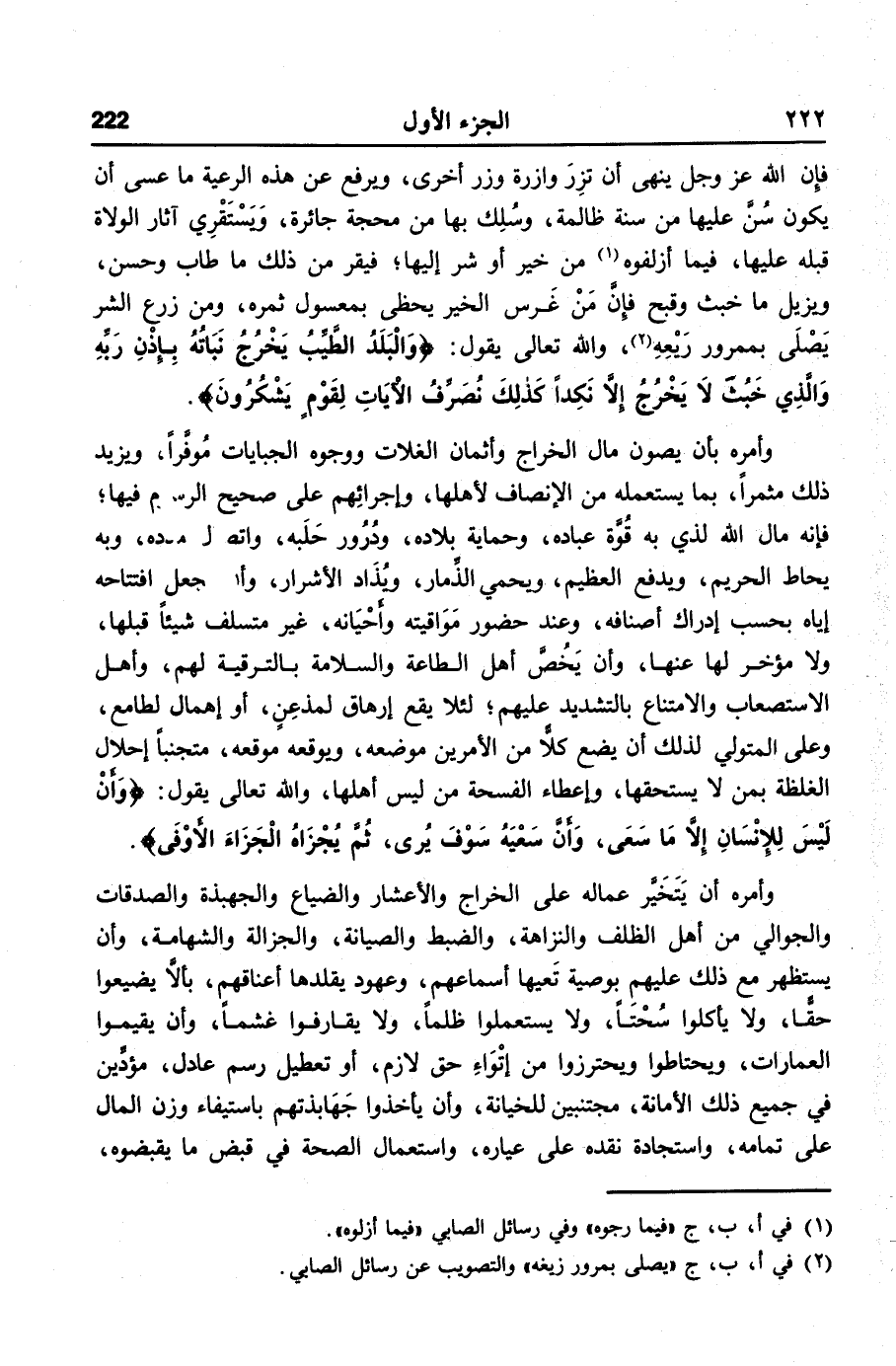 وأمره بأن يصون مال الخراج وأثمان الغلات ووجوه الجبايات موفّرا، ويزيد ذلك مثمرا، بما يستعمله من الإنصاف لأهلها، وإجرائهم على صحيح الرسوم فيها؛ فإنه مال الله لذي به قوّة عباده، وحماية بلاده، ودرور حلبه، واتصال مدده، وبه يحاط الحريم، ويدفع العظيم، ويحمي الذّمار، ويذاد الأشرار، وأن يجعل افتتاحه إياه بحسب إدراك أصنافه، وعند حضور مواقيته وأحيانه، غير متسلف شيئا قبلها، ولا مؤخر لها عنها، وأن يخصّ أهل الطاعة والسلامة بالترقية لهم، وأهل الاستصعاب والامتناع بالتشديد عليهم؛ لئلا يقع إرهاق لمذعن، أو إهمال لطامع، وعلى المتولي لذلك أن يضع كلّا من الأمرين موضعه، ويوقعه موقعه، متجنبا إحلال الغلظة بمن لا يستحقها، وإعطاء الفسحة من ليس أهلها، والله تعالى يقول: وأن ليس للإنسان إلا ما سعى، وأن سعيه سوف يرى، ثم يجزاه الجزاء الأوفى.