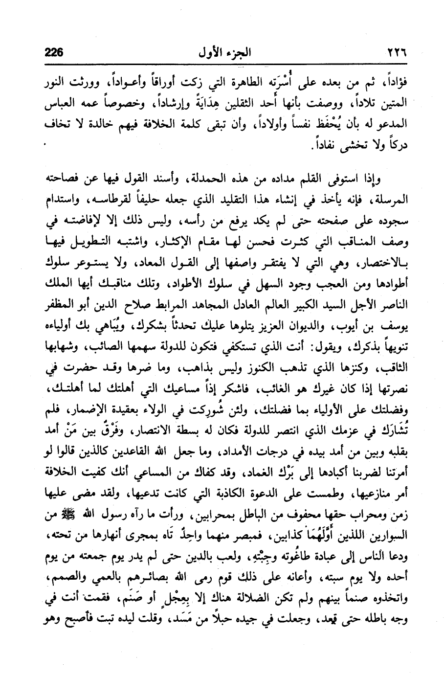 وإذا استوفى القلم مداده من هذه الحمدلة، وأسند القول فيها عن فصاحته المرسلة، فإنه يأخذ في إنشاء هذا التقليد الذي جعله حليفا لقرطاسه، واستدام سجوده على صفحته حتى لم يكد يرفع من رأسه، وليس ذلك إلا لإفاضته في وصف المناقب التي كثرت فحسن لها مقام الإكثار، واشتبه التطويل فيها بالاختصار، وهي التي لا يفتقر واصفها إلى القول المعاد، ولا يستوعر سلوك أطوادها ومن العجب وجود السهل في سلوك الأطواد، وتلك مناقبك أيها الملك الناصر الأجل السيد الكبير العالم العادل المجاهد المرابط صلاح الدين أبو المظفر يوسف بن أيوب، والديوان العزيز يتلوها عليك تحدثا بشكرك، ويباهي بك أولياءه تنويها بذكرك، ويقول: أنت الذي تستكفي فتكون للدولة سهمها الصائب، وشهابها الثاقب، وكنزها الذي تذهب الكنوز وليس بذاهب، وما ضرها وقد حضرت في نصرتها إذا كان غيرك هو الغائب، فاشكر إذا مساعيك التي أهلتك لما أهلتك، وفضلتك على الأولياء بما فضلتك، ولئن شوركت في الولاء بعقيدة الإضمار، فلم تشارك في عزمك الذي انتصر للدولة فكان له بسطة الانتصار، وفرق بين من أمد بقلبه وبين من أمد بيده في درجات الأمداد، وما جعل الله القاعدين كالذين قالوا لو أمرتنا لضربنا أكبادها إلى برك الغماد، وقد كفاك من المساعي أنك كفيت الخلافة أمر منازعيها، وطمست على الدعوة الكاذبة التي كانت تدعيها، ولقد مضى عليها زمن ومحراب حقها محفوف من الباطل بمحرابين، ورأت ما رآه رسول الله صلّى الله عليه وسلّم من السوارين اللذين أوّلهما كذابين، فمبصر منهما واحد تاه بمجرى أنهارها من تحته، ودعا الناس إلى عبادة طاغوته وجبته، ولعب بالدين حتى لم يدر يوم جمعته من يوم أحده ولا يوم سبته، وأعانه على ذلك قوم رمى الله بصائرهم بالعمي والصمم، واتخذوه صنما بينهم ولم تكن الضلالة هناك إلا بعجل أو صنم، فقمت أنت في وجه باطله حتى قعد، وجعلت في جيده حبلا من مسد، وقلت ليده تبت فأصبح وهو