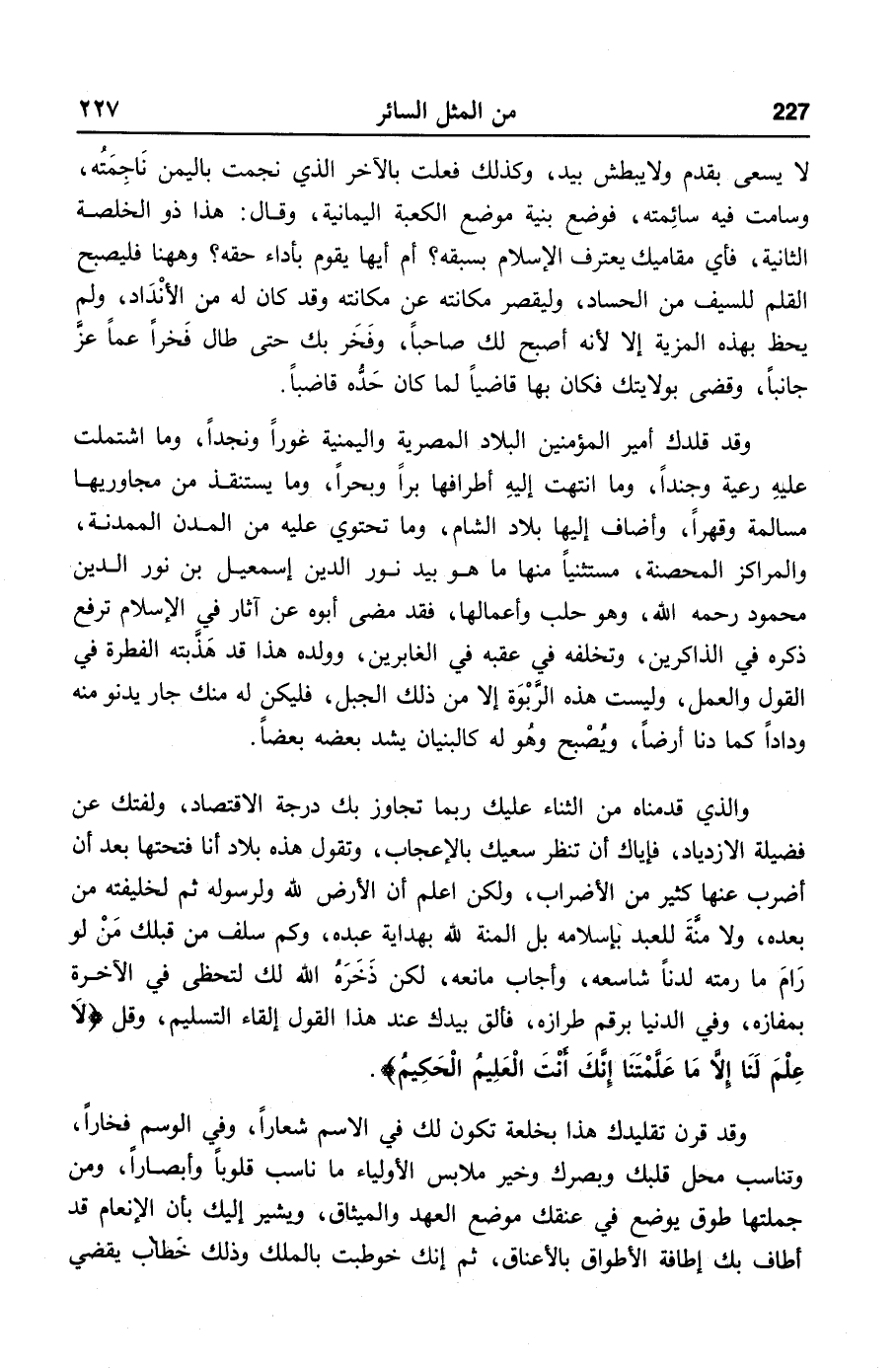 والذي قدمناه من الثناء عليك ربما تجاوز بك درجة الاقتصاد، ولفتك عن فضيلة الازدياد، فإياك أن تنظر سعيك بالإعجاب، وتقول هذه بلاد أنا فتحتها بعد أن أضرب عنها كثير من الأضراب، ولكن اعلم أن الأرض لله ولرسوله ثم لخليفته من بعده، ولا منّة للعبد بإسلامه بل المنة لله بهداية عبده، وكم سلف من قبلك من لو رام ما رمته لدنا شاسعه، وأجاب مانعه، لكن ذخره الله لك لتحظى في الآخرة بمفازه، وفي الدنيا برقم طرازه، فألق بيدك عند هذا القول إلقاء التسليم، وقل لا علم لنا إلا ما علمتنا إنك أنت العليم الحكيم.