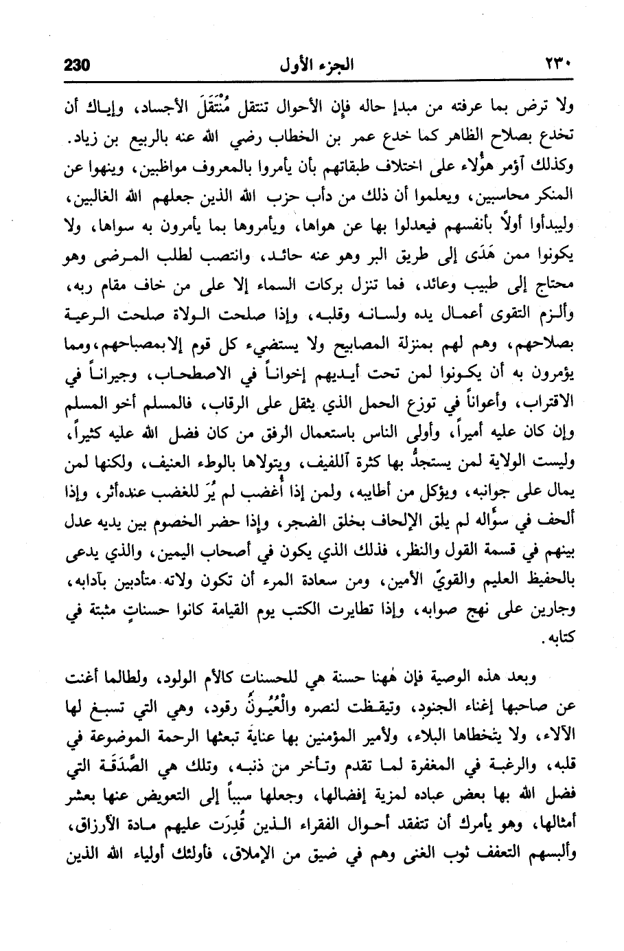 وكذلك اؤمر هؤلاء على اختلاف طبقاتهم بأن يأمروا بالمعروف مواظبين، وينهوا عن المنكر محاسبين، ويعلموا أن ذلك من دأب حزب الله الذين جعلهم الله الغالبين، وليبدأوا أولا بأنفسهم فيعدلوا بها عن هواها، ويأمروها بما يأمرون به سواها، ولا يكونوا ممن هدى إلى طريق البر وهو عنه حائد، وانتصب لطلب المرضى وهو محتاج إلى طبيب وعائد، فما تنزل بركات السماء إلا على من خاف مقام ربه، وألزم التقوى أعمال يده ولسانه وقلبه، وإذا صلحت الولاة صلحت الرعية بصلاحهم، وهم لهم بمنزلة المصابيح ولا يستضيء كل قوم إلا بمصباحهم، ومما يؤمرون به أن يكونوا لمن تحت أيديهم إخوانا في الاصطحاب، وجيرانا في الاقتراب، وأعوانا في توزع الحمل الذي يثقل على الرقاب، فالمسلم أخو المسلم وإن كان عليه أميرا، وأولى الناس باستعمال الرفق من كان فضل الله عليه كثيرا، وليست الولاية لمن يستجدّ بها كثرة اللفيف، ويتولاها بالوطء العنيف، ولكنها لمن يمال على جوانبه، ويؤكل من أطايبه، ولمن إذا أغضب لم ير للغضب عنده أثر، وإذا ألحف في سؤاله لم يلق الإلحاف بخلق الضجر، وإذا حضر الخصوم بين يديه عدل بينهم في قسمة القول والنظر، فذلك الذي يكون في أصحاب اليمين، والذي يدعى بالحفيظ العليم والقويّ الأمين، ومن سعادة المرء أن تكون ولاته متأدبين بآدابه، وجارين على نهج صوابه، وإذا تطايرت الكتب يوم القيامة كانوا حسنات مثبتة في كتابه.