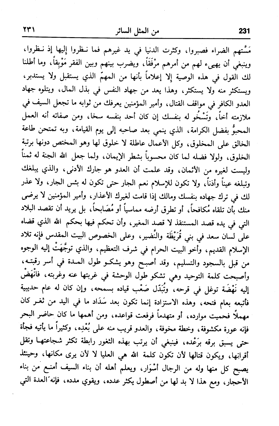 مسّتهم الضراء فصبروا، وكثرت الدنيا في يد غيرهم فما نظروا إليها إذ نظروا، وينبغي أن يهيئ لهم من أمرهم مرفقا، ويضرب بينهم وبين الفقر موبقا، وما أطلنا لك القول في هذه الوصية إلا إعلاما بأنها من المهمّ الذي يستقبل ولا يستدبر، ويستكثر منه ولا يستكثر، وهذا يعد من جهاد النفس في بذل المال، ويتلوه جهاد العدو الكافر في مواقف القتال، وأمير المؤمنين يعرفك من ثوابه ما تجعل السيف في ملازمته أخا، وتسخو له بنفسك إن كان أحد بنفسه سخا، ومن صفاته أنه العمل المحبوّ بفضل الكرامة، الذي ينمي بعد صاحبه إلى يوم القيامة، وبه تمتحن طاعة الخالق على المخلوق، وكل الأعمال عاطلة لا خلوق لها وهو المختص دونها برتبة الخلوق، ولولا فضله لما كان محسوبا بشطر الإيمان، ولما جعل الله الجنة له ثمنا وليست لغيره من الأثمان، وقد علمت أن العدو هو جارك الأدنى، والذي يبلغك وتبلغه عينا وأذنا، ولا تكون للإسلام نعم الجار حتى تكون له بئس الجار، ولا عذر لك في ترك جهاده بنفسك ومالك إذا قامت لغيرك الأعذار، وأمير المؤمنين لا يرضى منك بأن تلقاه مكافحا، أو تطرق أرضه مماسيا أو مصابحا، بل يريد أن تقصد البلاد التي في يده قصد المستنقذ لا قصد المغير، وأن تحكم فيها بحكم الله الذي قضاه على لسان سعد في بني قريظة والنّضير، وعلى الخصوص البيت المقدس فإنه تلاد الإسلام القديم، وأخو البيت الحرام في شرف التعظيم، والذي توجّهت إليه الوجوه من قبل بالسجود والتسليم، وقد أصبح وهو يشكو طول المدة في أسر رقبته، وأصبحت كلمة التوحيد وهي تشكو طول الوحشة في غربتها عنه وغربته، فانهض إليه نهضة توغل في قرحه، وتبدّل صعب قياده بسمحه، وإن كان له عام حديبية فأتبعه بعام فتحه، وهذه الاستزادة إنما تكون بعد سداد ما في اليد من ثغر كان مهملا فحميت موارده، أو متهدما فرفعت قواعده، ومن أهمها ما كان حاضر البحر فإنه عورة مكشوفة، وخطة مخوفة، والعدو قريب منه على بعده، وكثيرا ما يأتيه فجأة حتى يسبق برقه برعده، فينبغي أن يرتب بهذه الثغور رابطة تكثر شجاعتها وتقل أقرانها، ويكون قتالها لأن تكون كلمة الله هي العليا لا لأن يرى مكانها، وحينئذ يصبح كل منها وله من الرجال أسوار، ويعلم أهله أن بناء السيف أمنع من بناء الأحجار، ومع هذا لا بد لها من أصطول يكثر عدده، ويقوي مدده، فإنه العدة التي