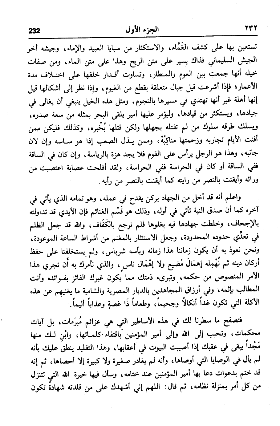 واعلم أنه قد أخل من الجهاد بركن يقدح في عمله، وهو تمامه الذي يأتي في آخره كما أن صدق النية تأتي في أوله، وذلك هو قسم الغنائم فإن الأيدي قد تداولته بالإجحاف، وخلطت جهادها فيه بغلوها فلم ترجع بالكفاف، والله قد جعل الظلم في تعدّي حدوده المحدودة، وجعل الاستئثار بالمغنم من أشراط الساعة الموعودة، ونحن نعوذ به أن يكون زماننا هذا زمانه وبأسه شرباس، ولم يستخلفنا على حفظ أركان دينه ثم نهمله إهمال مضيع ولا إهمال ناس، والذي نأمرك به أن تجري هذا الأمر المنصوص من حكمه، وتبرئ ذمتك مما يكون غيرك الفائز بفوائده وأنت المطالب بإثمه، وفي أرزاق المجاهدين بالديار المصرية والشامية ما يغنيهم عن هذه الأكلة التي تكون غدا أنكالا وجحيما، وطعاما ذا غصة وعذابا أليما.