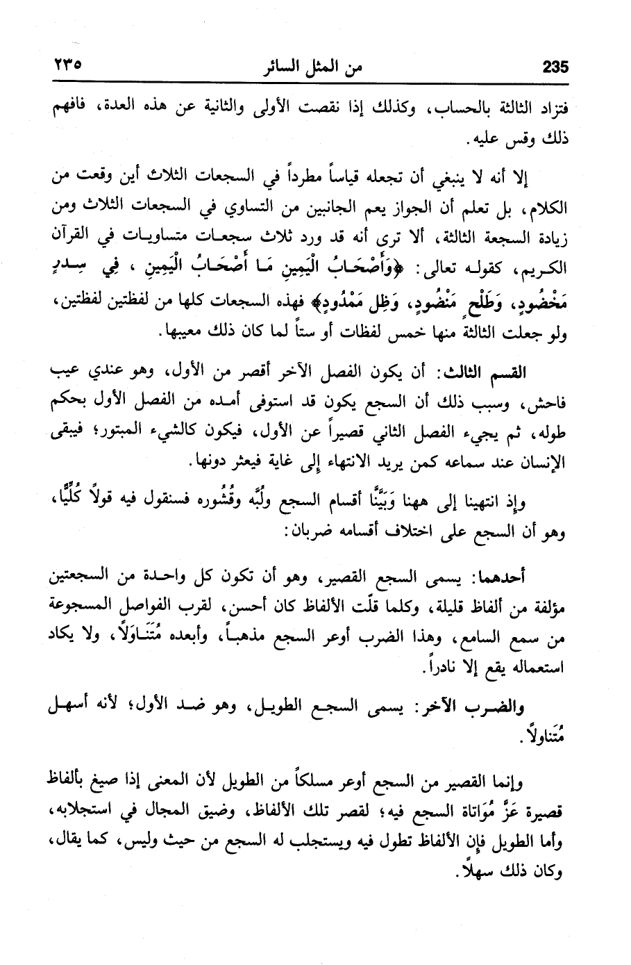 وإذ انتهينا إلى ههنا وبيّنّا أقسام السجع ولبّه وقشوره فسنقول فيه قولا كلّيّا، وهو أن السجع على اختلاف أقسامه ضربان: