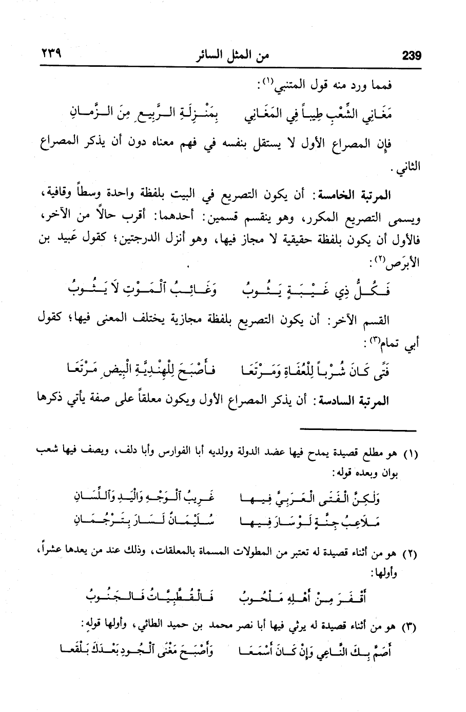 المرتبة الخامسة: أن يكون التصريع في البيت بلفظة واحدة وسطا وقافية، ويسمى التصريع المكرر، وهو ينقسم قسمين: أحدهما: أقرب حالا من الآخر، فالأول أن يكون بلفظة حقيقية لا مجاز فيها، وهو أنزل الدرجتين؛ كقول عبيد بن الأبرص «2» :