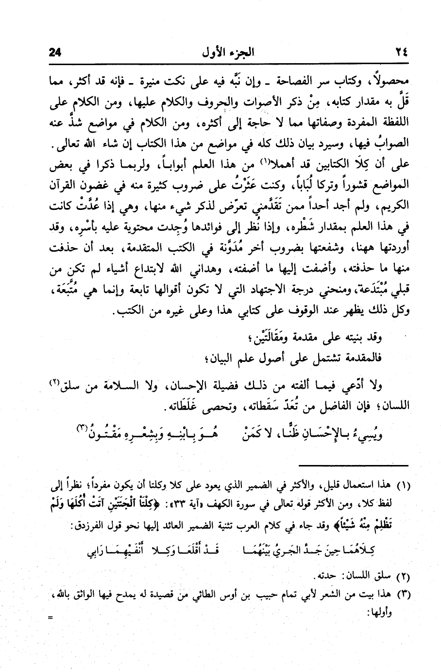 محصولا، وكتاب سر الفصاحة- وإن نبّه فيه على نكت منيرة- فإنه قد أكثر، مما قلّ به مقدار كتابه، من ذكر الأصوات والحروف والكلام عليها، ومن الكلام على اللفظة المفردة وصفاتها مما لا حاجة إلى أكثره، ومن الكلام في مواضع شذّ عنه الصواب فيها، وسيرد بيان ذلك كله في مواضع من هذا الكتاب إن شاء الله تعالى.