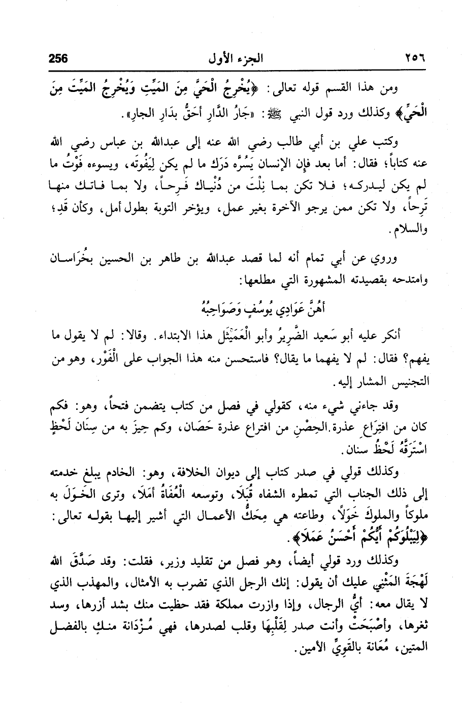 وكذلك قولي في صدر كتاب إلى ديوان الخلافة، وهو: الخادم يبلغ خدمته إلى ذلك الجناب التي تمطره الشفاه قبلا، وتوسعه العفاة أملا، وترى الخول به ملوكا والملوك خولا، وطاعته هي محكّ الأعمال التي أشير إليها بقوله تعالى: