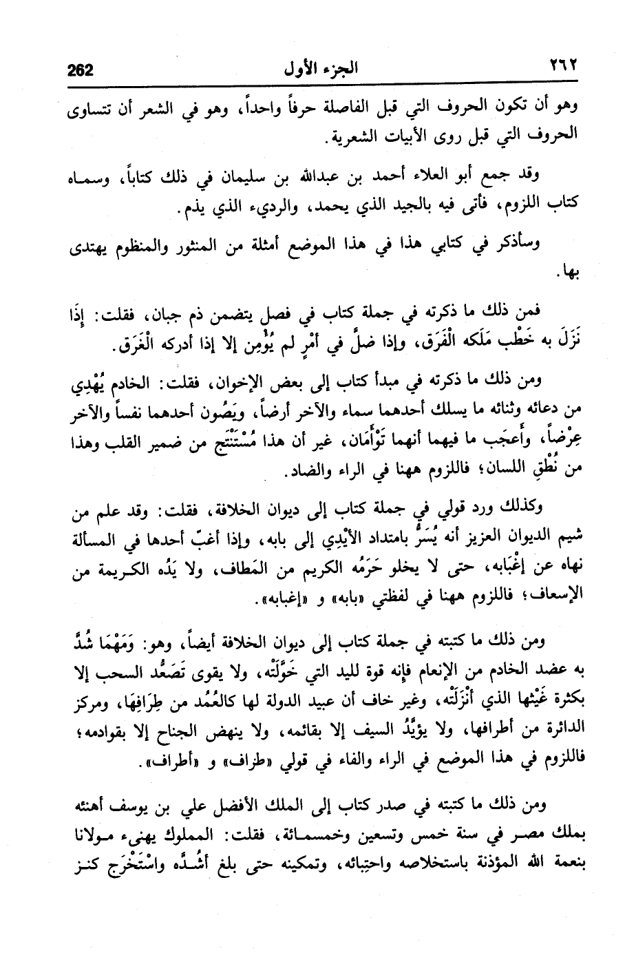 ومن ذلك ما ذكرته في مبدأ كتاب إلى بعض الإخوان، فقلت: الخادم يهدي من دعائه وثنائه ما يسلك أحدهما سماء والآخر أرضا، ويصون أحدهما نفسا والآخر عرضا، وأعجب ما فيهما أنهما تؤأمان، غير أن هذا مستنتج من ضمير القلب وهذا من نطق اللسان؛ فاللزوم ههنا في الراء والضاد.