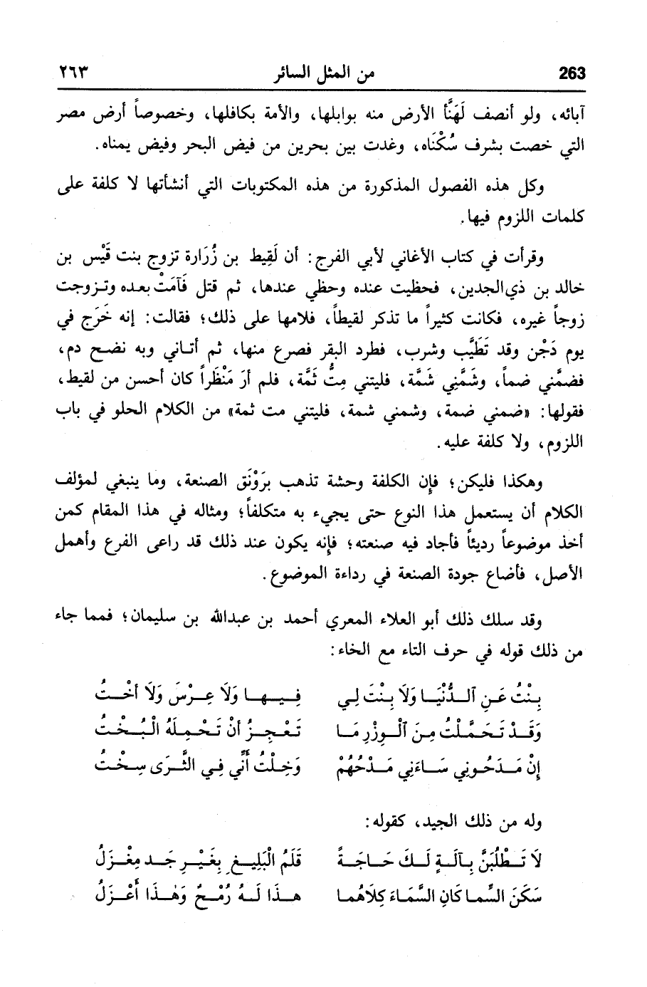 وقرأت في كتاب الأغاني لأبي الفرج: أن لقيط بن زرارة تزوج بنت قيس بن خالد بن ذي الجدين، فحظيت عنده وحظي عندها، ثم قتل فآمت بعده وتزوجت زوجا غيره، فكانت كثيرا ما تذكر لقيطا، فلامها على ذلك؛ فقالت: إنه خرج في يوم دجن وقد تطيّب وشرب، فطرد البقر فصرع منها، ثم أتاني وبه نضح دم، فضمّني ضما، وشمّني شمّة، فليتني متّ ثمّة، فلم أر منظرا كان أحسن من لقيط، فقولها: «ضمني ضمة، وشمني شمة، فليتني مت ثمة» من الكلام الحلو في باب اللزوم، ولا كلفة عليه.
