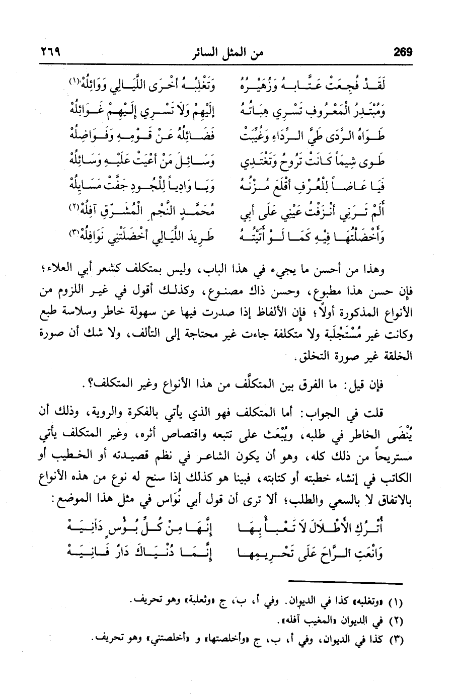 وهذا من أحسن ما يجيء في هذا الباب، وليس بمتكلف كشعر أبي العلاء؛ فإن حسن هذا مطبوع، وحسن ذاك مصنوع، وكذلك أقول في غير اللزوم من الأنواع المذكورة أولا؛ فإن الألفاظ إذا صدرت فيها عن سهولة خاطر وسلاسة طبع وكانت غير مستجلبة ولا متكلفة جاءت غير محتاجة إلى التألف، ولا شك أن صورة الخلقة غير صورة التخلق.