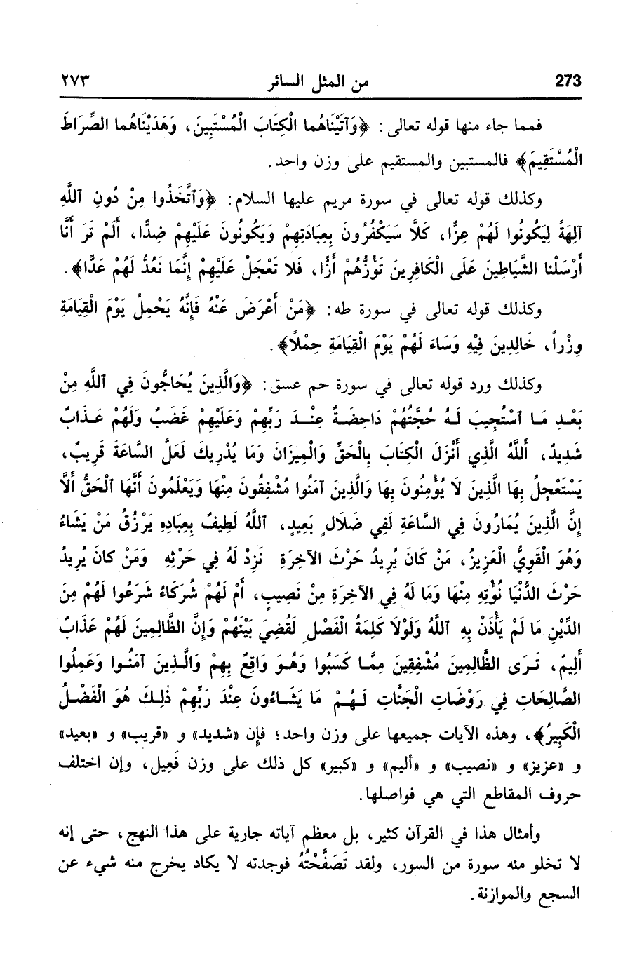 وأمثال هذا في القرآن كثير، بل معظم آياته جارية على هذا النهج، حتى إنه لا تخلو منه سورة من السور، ولقد تصفّحته فوجدته لا يكاد يخرج منه شيء عن السجع والموازنة.