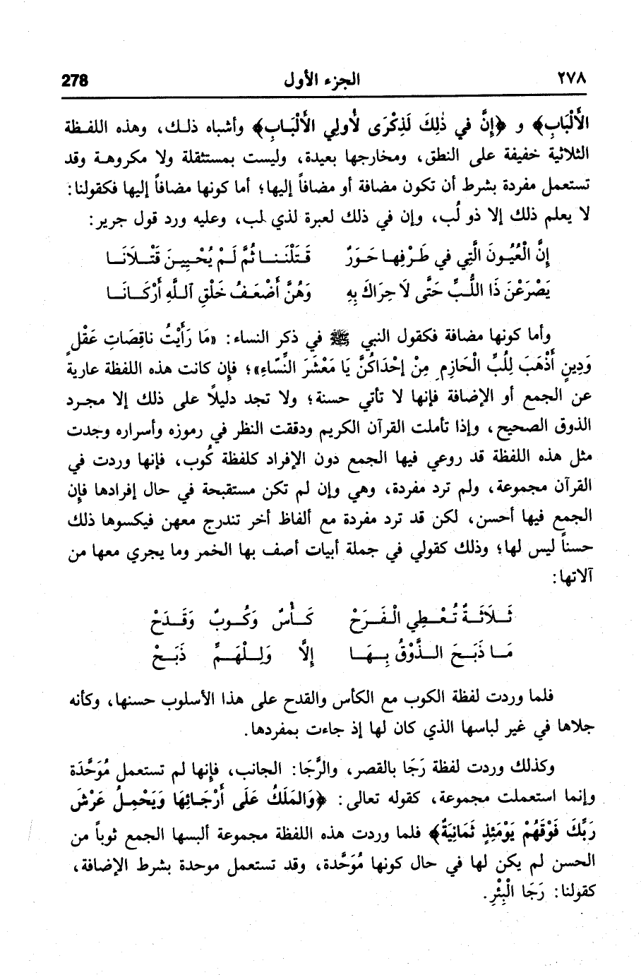 وأما كونها مضافة فكقول النبي صلّى الله عليه وسلّم في ذكر النساء: «ما رأيت ناقصات عقل ودين أذهب للبّ الحازم من إحداكنّ يا معشر النّساء» ؛ فإن كانت هذه اللفظة عارية عن الجمع أو الإضافة فإنها لا تأتي حسنة؛ ولا تجد دليلا على ذلك إلا مجرد الذوق الصحيح، وإذا تأملت القرآن الكريم ودققت النظر في رموزه وأسراره وجدت مثل هذه اللفظة قد روعي فيها الجمع دون الإفراد كلفظة كوب، فإنها وردت في القرآن مجموعة، ولم ترد مفردة، وهي وإن لم تكن مستقبحة في حال إفرادها فإن الجمع فيها أحسن، لكن قد ترد مفردة مع ألفاظ أخر تندرج معهن فيكسوها ذلك حسنا ليس لها؛ وذلك كقولي في جملة أبيات أصف بها الخمر وما يجري معها من آلاتها:
