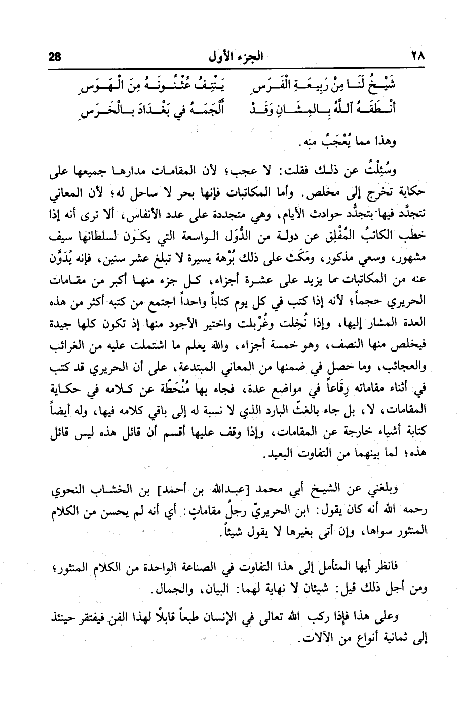 وبلغني عن الشيخ أبي محمد [عبد الله بن أحمد] بن الخشاب النحوي رحمه الله أنه كان يقول: ابن الحريريّ رجل مقامات: أي أنه لم يحسن من الكلام المنثور سواها، وإن أتى بغيرها لا يقول شيئا.