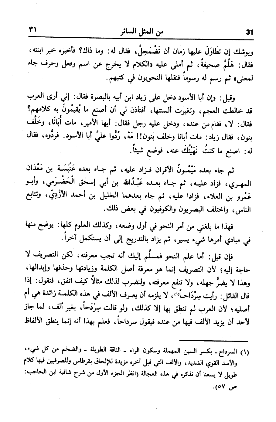 فإن قيل: أما علم النحو فمسلّم إليك أنه تجب معرفته، لكن التصريف لا حاجة إليه؛ لأن التصريف إنما هو معرفة أصل الكلمة وزيادتها وحذفها وإبدالها، وهذا لا يضرّ جهله، ولا تنفع معرفته، ولنضرب لذلك مثالا كيف اتفق، فنقول: إذا قال القائل: رأيت سرداحا «1» ، لا يلزمه أن يعرف الألف في هذه الكلمة زائدة هي أم أصليه؛ لأن العرب لم تنطق بها إلا كذلك، ولو قالت سردحا، بغير ألف، لما جاز لأحد أن يزيد الألف فيها من عنده فيقول سرداحا، فعلم بهذا أنه إنما ينطق الألفاظ