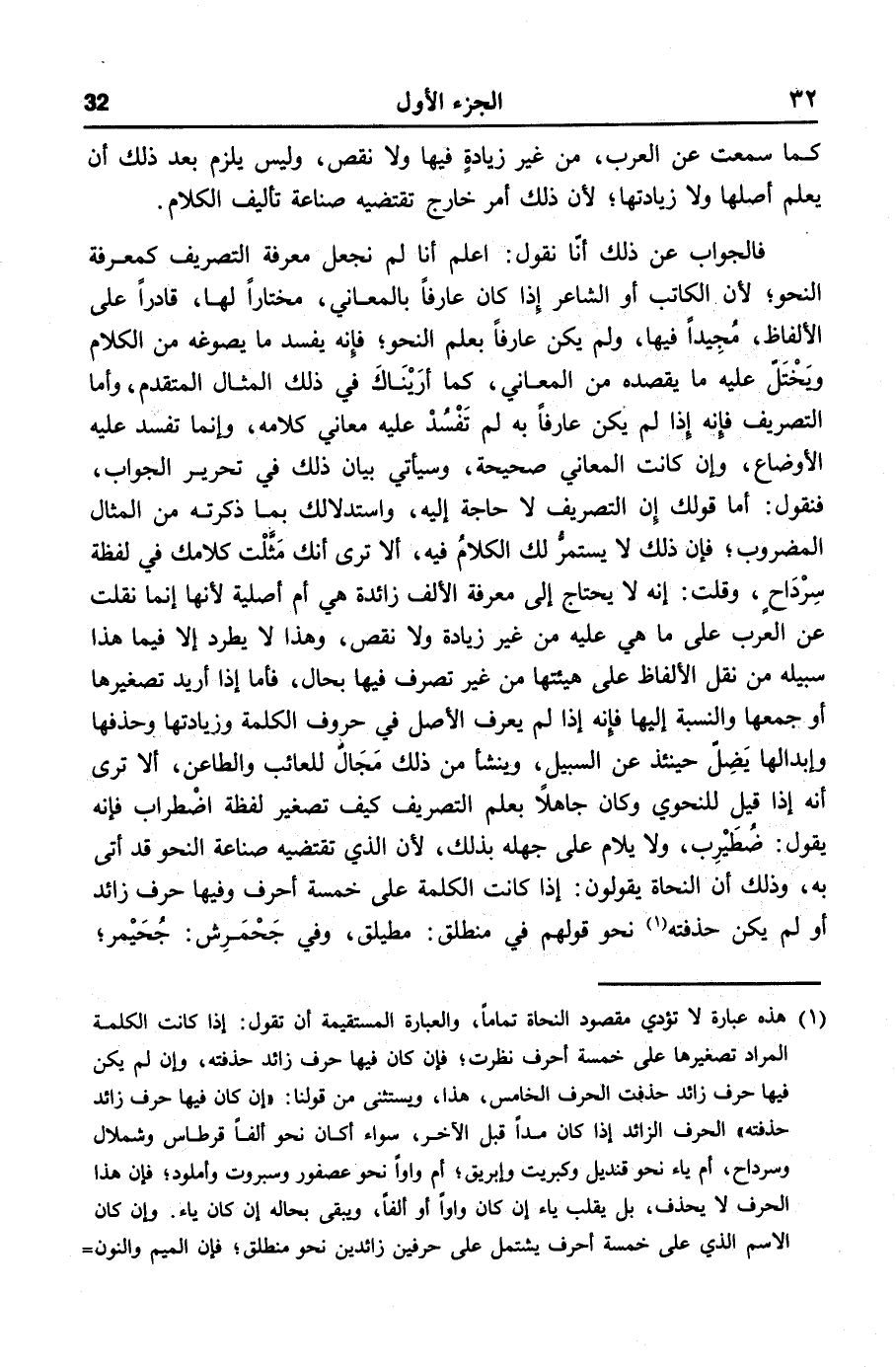 فالجواب عن ذلك أنّا نقول: اعلم أنا لم نجعل معرفة التصريف كمعرفة النحو؛ لأن الكاتب أو الشاعر إذا كان عارفا بالمعاني، مختارا لها، قادرا على الألفاظ، مجيدا فيها، ولم يكن عارفا بعلم النحو؛ فإنه يفسد ما يصوغه من الكلام ويختلّ عليه ما يقصده من المعاني، كما أريناك في ذلك المثال المتقدم، وأما التصريف فإنه إذا لم يكن عارفا به لم تفسد عليه معاني كلامه، وإنما تفسد عليه الأوضاع، وإن كانت المعاني صحيحة، وسيأتي بيان ذلك في تحرير الجواب، فنقول: أما قولك إن التصريف لا حاجة إليه، واستدلالك بما ذكرته من المثال المضروب؛ فإن ذلك لا يستمرّ لك الكلام فيه، ألا ترى أنك مثّلت كلامك في لفظة سرداح، وقلت: إنه لا يحتاج إلى معرفة الألف زائدة هي أم أصلية لأنها إنما نقلت عن العرب على ما هي عليه من غير زيادة ولا نقص، وهذا لا يطرد إلا فيما هذا سبيله من نقل الألفاظ على هيئتها من غير تصرف فيها بحال، فأما إذا أريد تصغيرها أو جمعها والنسبة إليها فإنه إذا لم يعرف الأصل في حروف الكلمة وزيادتها وحذفها وإبدالها يضلّ حينئذ عن السبيل، وينشأ من ذلك مجال للعائب والطاعن، ألا ترى أنه إذا قيل للنحوي وكان جاهلا بعلم التصريف كيف تصغير لفظة اضطراب فإنه يقول: ضطيرب، ولا يلام على جهله بذلك، لأن الذي تقتضيه صناعة النحو قد أتى به، وذلك أن النحاة يقولون: إذا كانت الكلمة على خمسة أحرف وفيها حرف زائد أو لم يكن حذفته «1» نحو قولهم في منطلق: مطيلق، وفي جحمرش: جحيمر؛