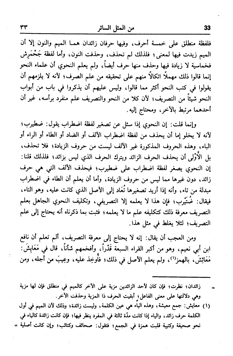 إن النحوي يصغر لفظة اضطراب على ضطيرب؛ فيحذف الألف التي هي حرف زائد، دون غيرها مما ليس من حروف الزيادة، وأما أن يعلم أن الطاء في اضطراب مبدلة من تاء، وأنه إذا أريد تصغيرها تعاد إلى الأصل الذي كانت عليه، وهو التاء، فيقال: ضتيرب؛ فإن هذا لا يعلمه إلا التصريفي، وتكليف النحوي الجاهل بعلم التصريف معرفة ذلك كتكليفه علم ما لا يعلمه؛ فثبت بما ذكرناه أنه يحتاج إلى علم التصريف؛ لئلا يغلط في مثل هذا.