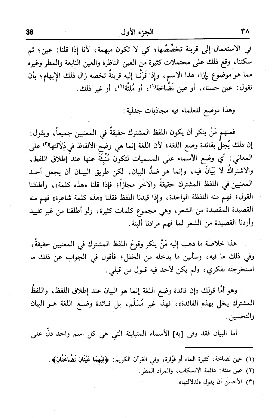 وهو أمّا قولك «إن فائدة وضع اللغة إنما هو البيان عند إطلاق اللفظ، واللفظ المشترك يخل بهذه الفائدة» ، فهذا غير مسلّم، بل فائدة وضع اللغة هو البيان والتحسين.