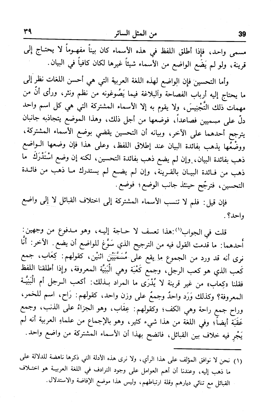 أحدهما: ما قدمت القول فيه من الترجيح الذي سوّغ للواضع أن يضع. الآخر: أنّا نرى أنه قد ورد من الجموع ما يقع على مسمّيين اثنين، كقولهم: كعاب، جمع كعب الذي هو كعب الرجل، وجمع كعبة وهي البنيّة المعروفة، وإذا أطلقنا اللفظ فقلنا «كعاب» من غير قرينة لا يدرى ما المراد بذلك: أكعب الرجل أم البنيّة المعروفة؟ وكذلك ورد واحد وجمع على وزن واحد، كقولهم: راح، اسم للخمر، وراح جمع راحة وهي الكف؛ وكقولهم: عقاب، وهو الجزاء على الذنب، وجمع عقبة أيضا؛ وفي اللغة من هذا شيء كثير، وهو بالإجماع من علماء العربية أنه لم يجر فيه خلاف بين القبائل، فاتضح بهذا أن الأسماء المشتركة من واضع واحد.