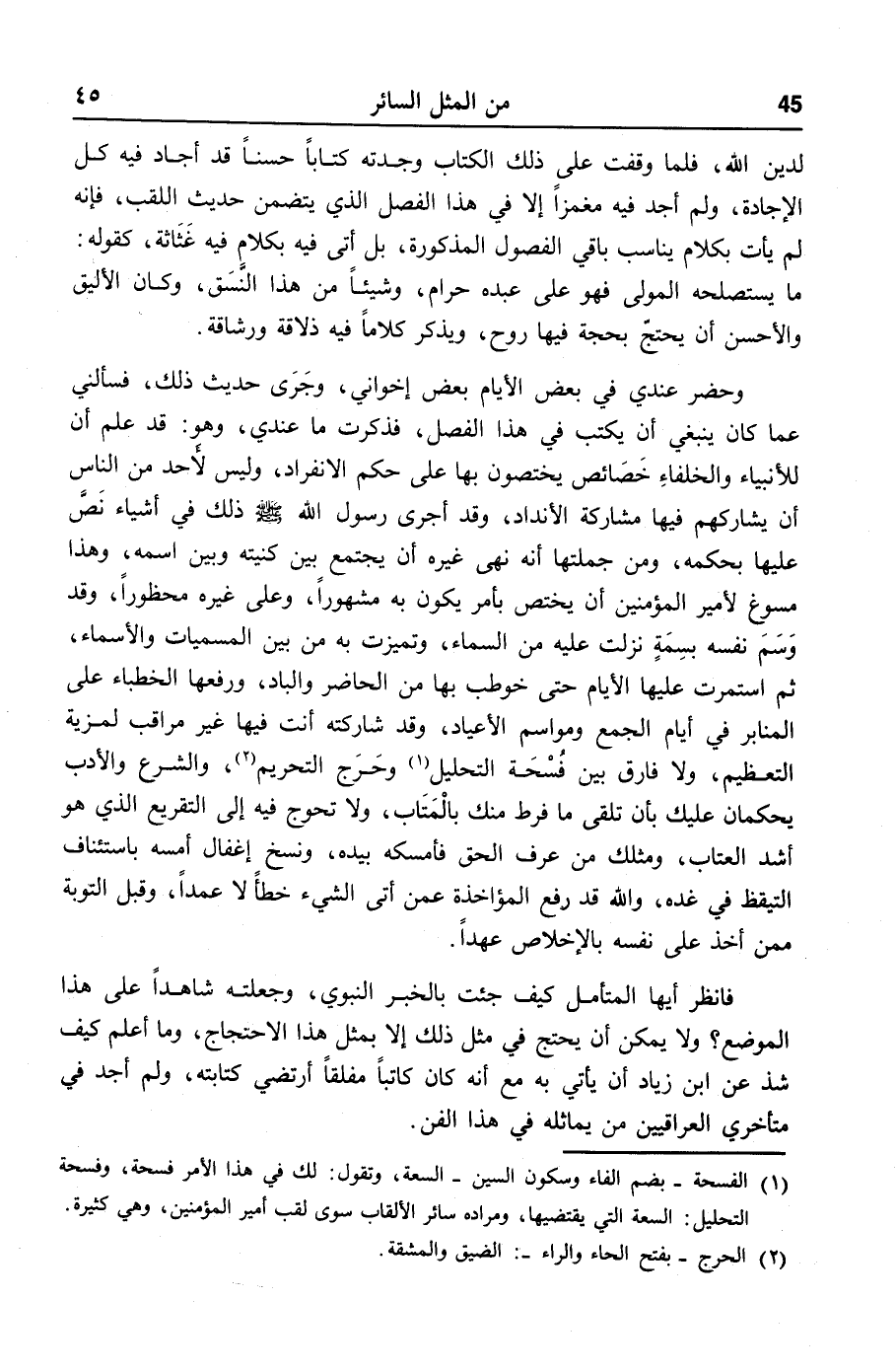 لدين الله، فلما وقفت على ذلك الكتاب وجدته كتابا حسنا قد أجاد فيه كل الإجادة، ولم أجد فيه مغمزا إلا في هذا الفصل الذي يتضمن حديث اللقب، فإنه لم يأت بكلام يناسب باقي الفصول المذكورة، بل أتى فيه بكلام فيه غثاثة، كقوله: