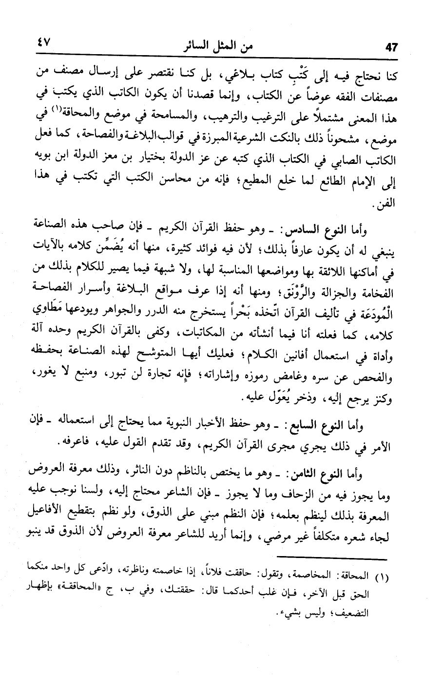 وهو حفظ القرآن الكريم- فإن صاحب هذه الصناعة ينبغي له أن يكون عارفا بذلك؛ لأن فيه فوائد كثيرة، منها أنه يضمّن كلامه بالآيات في أماكنها اللائقة بها ومواضعها المناسبة لها، ولا شبهة فيما يصير للكلام بذلك من الفخامة والجزالة والرّونق؛ ومنها أنه إذا عرف مواقع البلاغة وأسرار الفصاحة المودعة في تأليف القرآن اتّخذه بحرا يستخرج منه الدرر والجواهر ويودعها مطاوي كلامه، كما فعلته أنا فيما أنشأته من المكاتبات، وكفى بالقرآن الكريم وحده آلة وأداة في استعمال أفانين الكلام؛ فعليك أيها المتوشح لهذه الصناعة بحفظه والفحص عن سره وغامض رموزه وإشاراته؛ فإنه تجارة لن تبور، ومنبع لا يغور، وكنز يرجع إليه، وذخر يعوّل عليه.