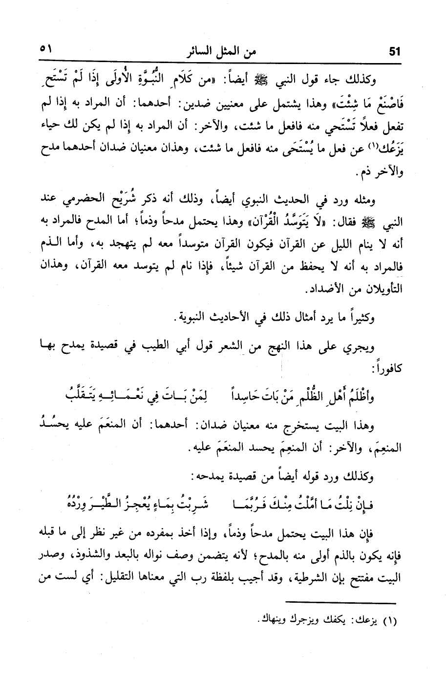 ومثله ورد في الحديث النبوي أيضا، وذلك أنه ذكر شريح الحضرمي عند النبي صلّى الله عليه وسلّم فقال: «لا يتوسّد القرآن» وهذا يحتمل مدحا وذما؛ أما المدح فالمراد به أنه لا ينام الليل عن القرآن فيكون القرآن متوسدا معه لم يتهجد به، وأما الذم فالمراد به أنه لا يحفظ من القرآن شيئا، فإذا نام لم يتوسد معه القرآن، وهذان التأويلان من الأضداد.
