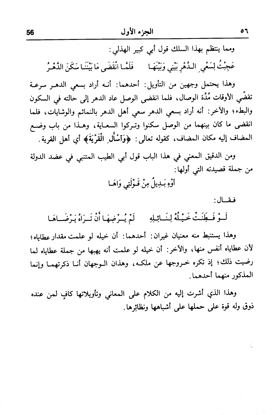 وهذا يحتمل وجهين من التأويل: أحدهما: أنه أراد بسعي الدهر سرعة تقضّي الأوقات مدّة الوصال، فلما انقضى الوصل عاد الدهر إلى حالته في السكون والبطء؛ والآخر: أنه أراد بسعي الدهر سعي أهل الدهر بالنمائم والوشايات، فلما انقضى ما كان بينهما من الوصل سكنوا وتركوا السعاية، وهذا من باب وضع المضاف إليه مكان المضاف، كقوله تعالى: «وسئل القرية»