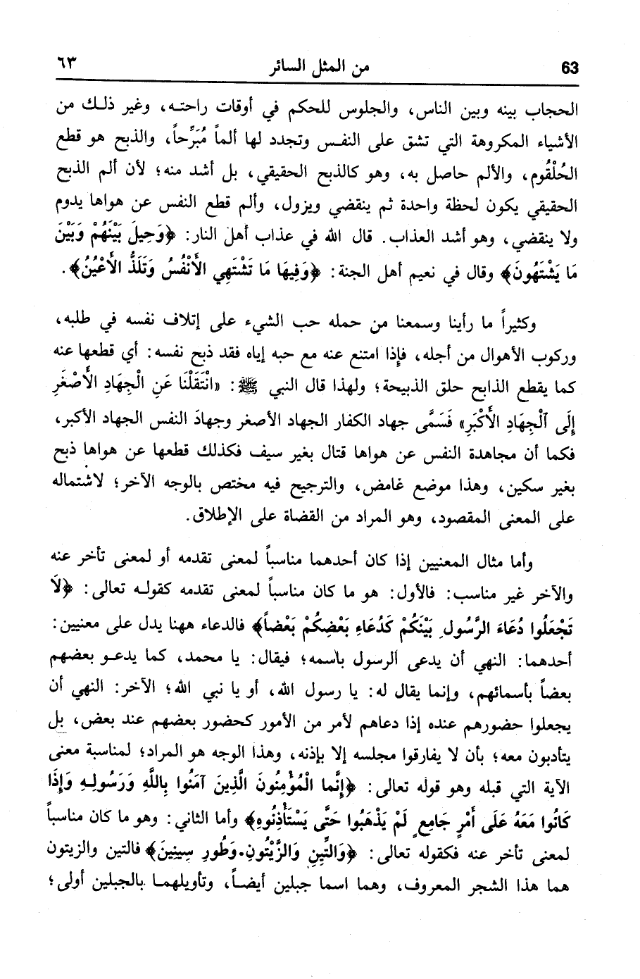وكثيرا ما رأينا وسمعنا من حمله حب الشيء على إتلاف نفسه في طلبه، وركوب الأهوال من أجله، فإذا امتنع عنه مع حبه إياه فقد ذبح نفسه: أي قطعها عنه كما يقطع الذابح حلق الذبيحة؛ ولهذا قال النبي صلّى الله عليه وسلّم: «انتقلنا عن الجهاد الأصغر إلى الجهاد الأكبر» فسمّى جهاد الكفار الجهاد الأصغر وجهاد النفس الجهاد الأكبر، فكما أن مجاهدة النفس عن هواها قتال بغير سيف فكذلك قطعها عن هواها ذبح بغير سكين، وهذا موضع غامض، والترجيح فيه مختص بالوجه الآخر؛ لاشتماله على المعنى المقصود، وهو المراد من القضاة على الإطلاق.