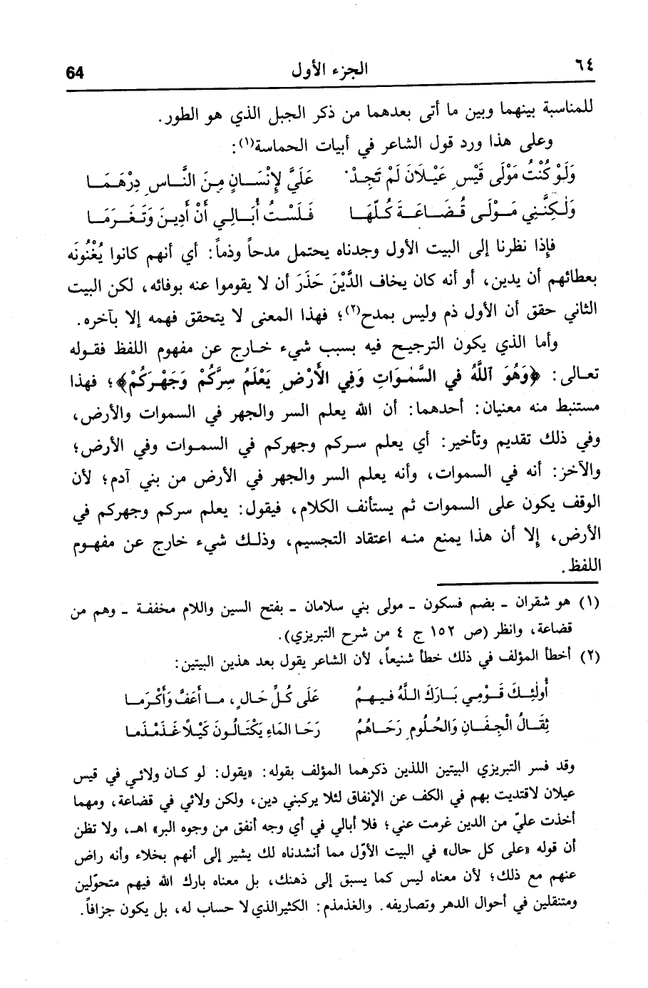 ؛ فهذا مستنبط منه معنيان: أحدهما: أن الله يعلم السر والجهر في السموات والأرض، وفي ذلك تقديم وتأخير: أي يعلم سركم وجهركم في السموات وفي الأرض؛ والآخر: أنه في السموات، وأنه يعلم السر والجهر في الأرض من بني آدم؛ لأن الوقف يكون على السموات ثم يستأنف الكلام، فيقول: يعلم سركم وجهركم في الأرض، إلا أن هذا يمنع منه اعتقاد التجسيم، وذلك شيء خارج عن مفهوم اللفظ.