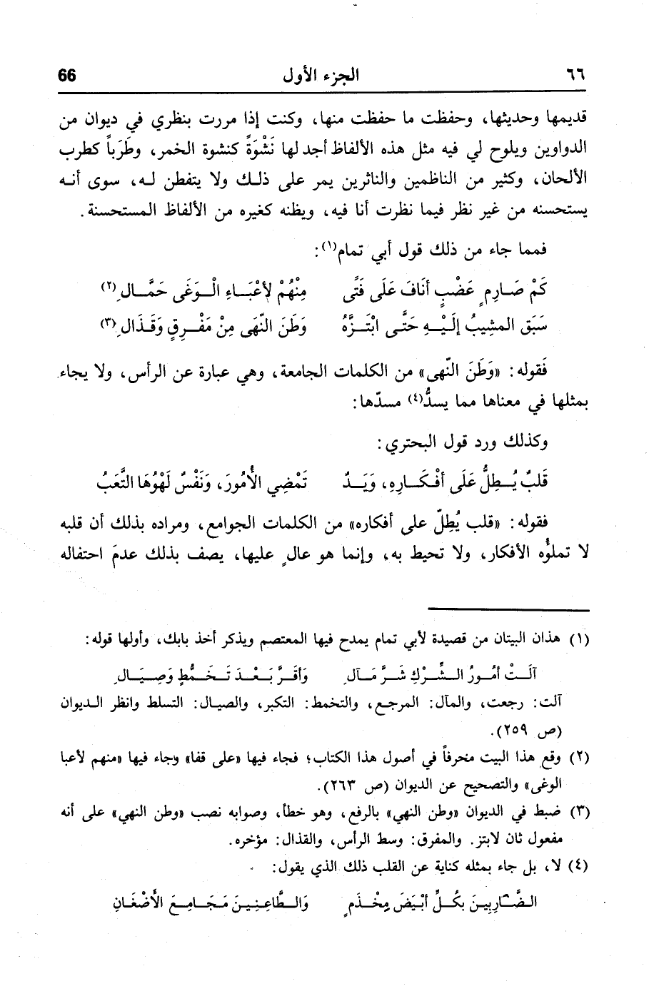 قديمها وحديثها، وحفظت ما حفظت منها، وكنت إذا مررت بنظري في ديوان من الدواوين ويلوح لي فيه مثل هذه الألفاظ أجد لها نشوة كنشوة الخمر، وطربا كطرب الألحان، وكثير من الناظمين والناثرين يمر على ذلك ولا يتفطن له، سوى أنه يستحسنه من غير نظر فيما نظرت أنا فيه، ويظنه كغيره من الألفاظ المستحسنة.