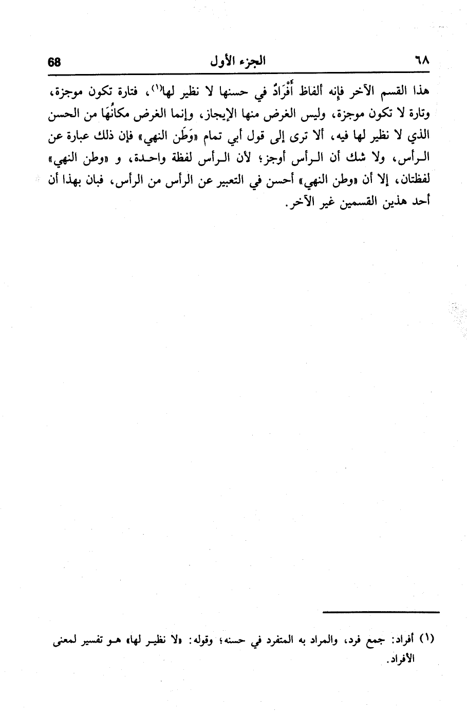 هذا القسم الآخر فإنه ألفاظ أفراد في حسنها لا نظير لها «1» ، فتارة تكون موجزة، وتارة لا تكون موجزة، وليس الغرض منها الإيجاز، وإنما الغرض مكانها من الحسن الذي لا نظير لها فيه، ألا ترى إلى قول أبي تمام «وطن النهي» فإن ذلك عبارة عن الرأس، ولا شك أن الرأس أوجز؛ لأن الرأس لفظة واحدة، و «وطن النهي» لفظتان، إلا أن «وطن النهي» أحسن في التعبير عن الرأس من الرأس، فبان بهذا أن أحد هذين القسمين غير الآخر.