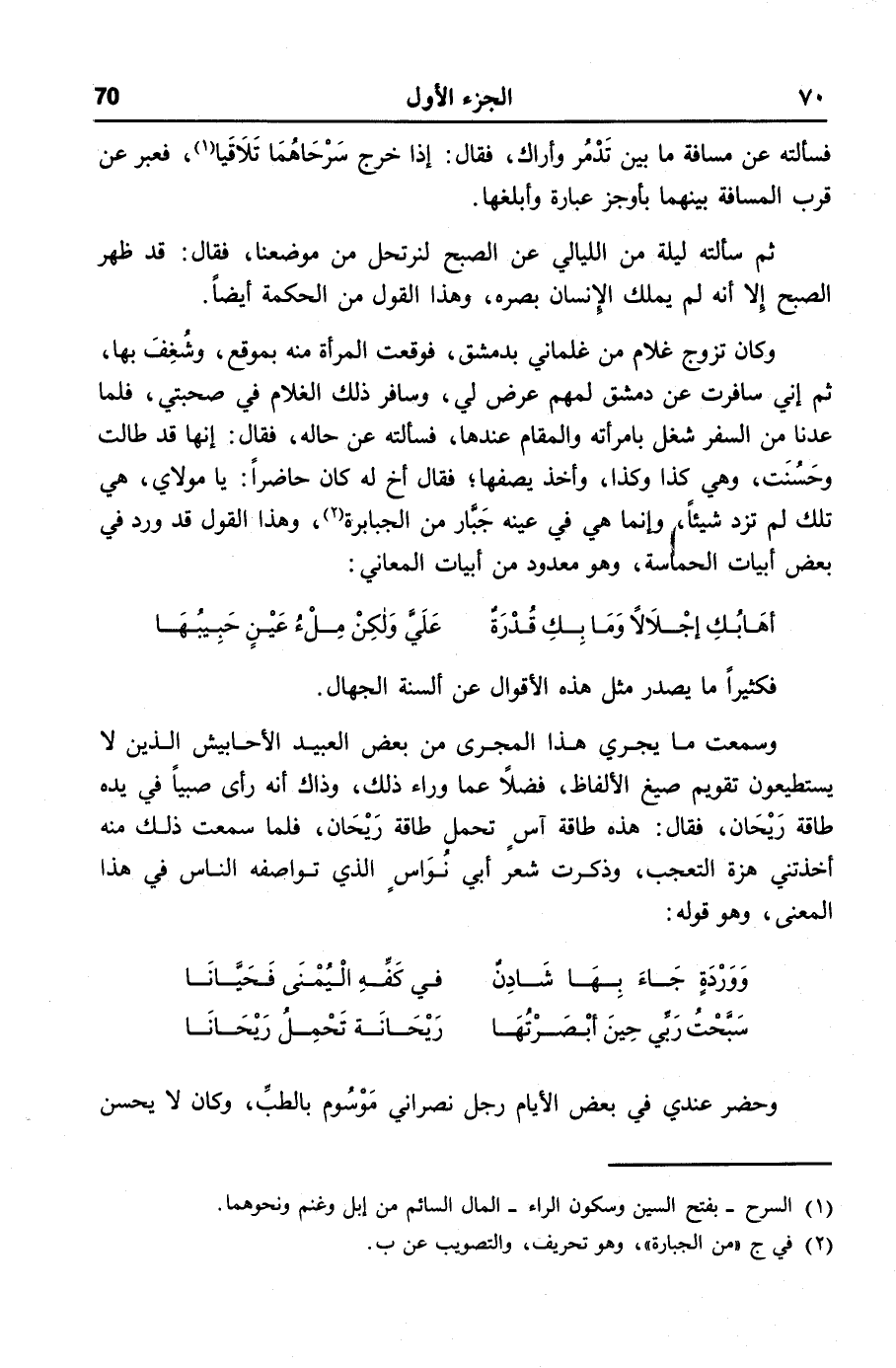 فسألته عن مسافة ما بين تدمر وأراك، فقال: إذا خرج سرحاهما تلاقيا «1» ، فعبر عن قرب المسافة بينهما بأوجز عبارة وأبلغها.