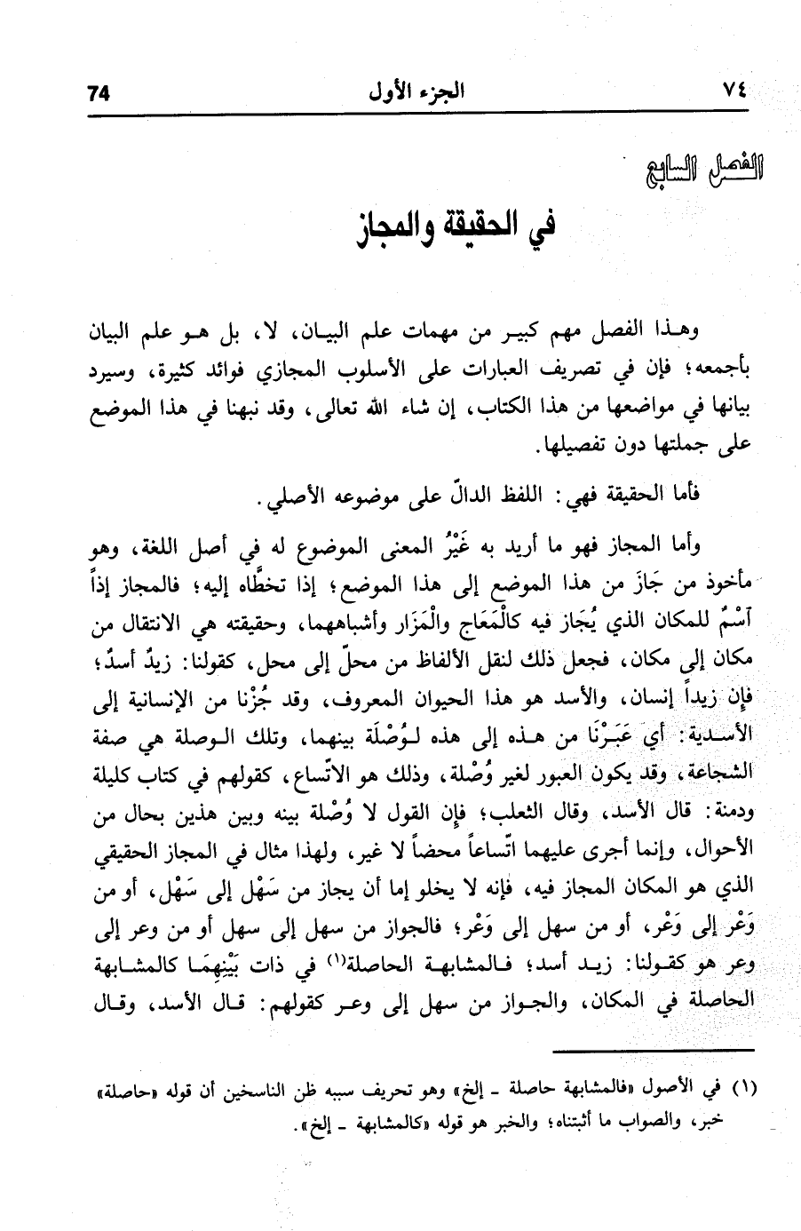 وأما المجاز فهو ما أريد به غير المعنى الموضوع له في أصل اللغة، وهو مأخوذ من جاز من هذا الموضع إلى هذا الموضع؛ إذا تخطّاه إليه؛ فالمجاز إذا اسم للمكان الذي يجاز فيه كالمعاج والمزار وأشباههما، وحقيقته هي الانتقال من مكان إلى مكان، فجعل ذلك لنقل الألفاظ من محلّ إلى محل، كقولنا: زيد أسد؛ فإن زيدا إنسان، والأسد هو هذا الحيوان المعروف، وقد جزنا من الإنسانية إلى الأسدية: أي عبرنا من هذه إلى هذه لوصلة بينهما، وتلك الوصلة هي صفة الشجاعة، وقد يكون العبور لغير وصلة، وذلك هو الاتّساع، كقولهم في كتاب كليلة ودمنة: قال الأسد، وقال الثعلب؛ فإن القول لا وصلة بينه وبين هذين بحال من الأحوال، وإنما أجرى عليهما اتّساعا محضا لا غير، ولهذا مثال في المجاز الحقيقي الذي هو المكان المجاز فيه، فإنه لا يخلو إما أن يجاز من سهل إلى سهل، أو من وعر إلى وعر، أو من سهل إلى وعر؛ فالجواز من سهل إلى سهل أو من وعر إلى وعر هو كقولنا: زيد أسد؛ فالمشابهة الحاصلة «1» في ذات بينهما كالمشابهة الحاصلة في المكان، والجواز من سهل إلى وعر كقولهم: قال الأسد، وقال