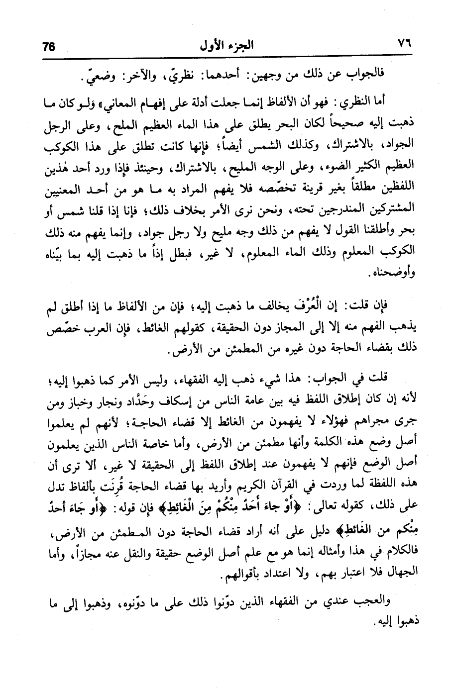 قلت في الجواب: هذا شيء ذهب إليه الفقهاء، وليس الأمر كما ذهبوا إليه؛ لأنه إن كان إطلاق اللفظ فيه بين عامة الناس من إسكاف وحدّاد ونجار وخباز ومن جرى مجراهم فهؤلاء لا يفهمون من الغائط إلا قضاء الحاجة؛ لأنهم لم يعلموا أصل وضع هذه الكلمة وأنها مطمئن من الأرض، وأما خاصة الناس الذين يعلمون أصل الوضع فإنهم لا يفهمون عند إطلاق اللفظ إلى الحقيقة لا غير، ألا ترى أن هذه اللفظة لما وردت في القرآن الكريم وأريد بها قضاء الحاجة قرنت بألفاظ تدل على ذلك، كقوله تعالى: أو جاء أحد منكم من الغائط*