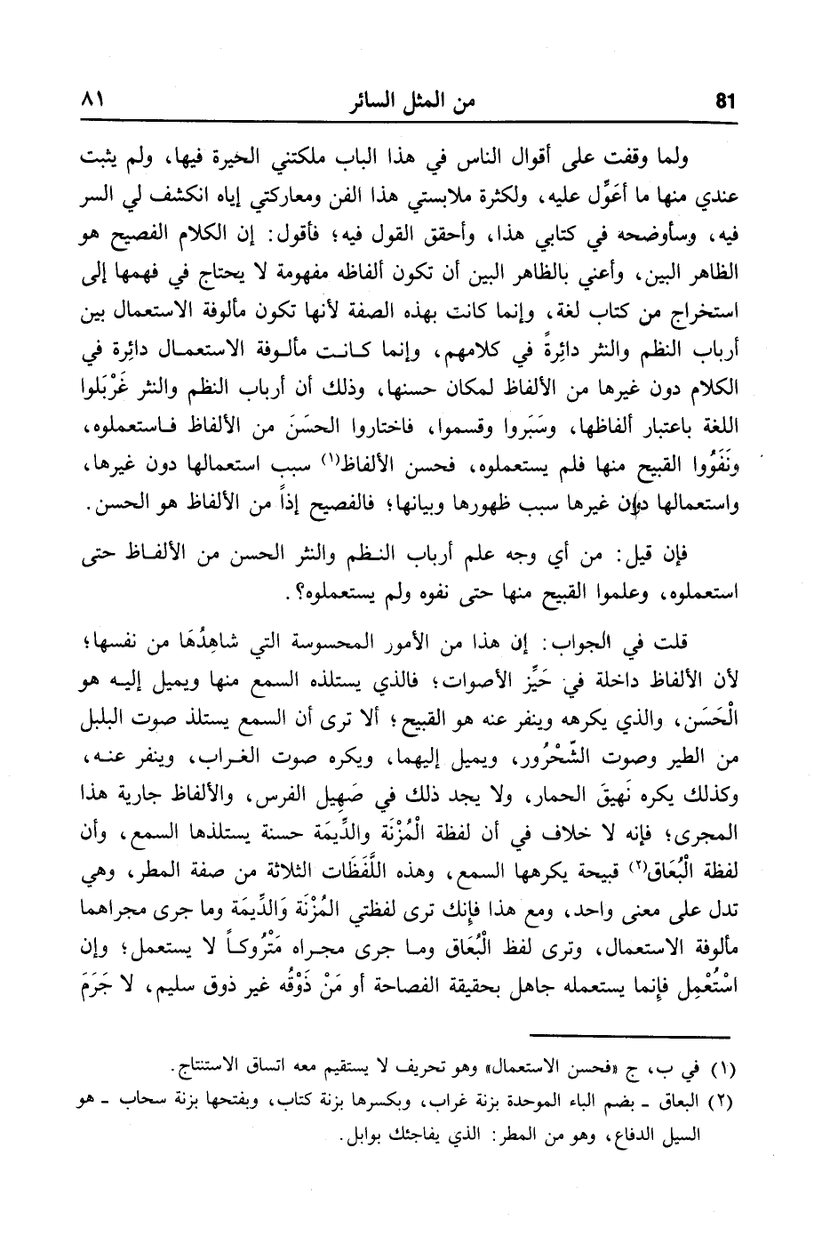 قلت في الجواب: إن هذا من الأمور المحسوسة التي شاهدها من نفسها؛ لأن الألفاظ داخلة في حيّز الأصوات؛ فالذي يستلذه السمع منها ويميل إليه هو الحسن، والذي يكرهه وينفر عنه هو القبيح؛ ألا ترى أن السمع يستلذ صوت البلبل من الطير وصوت الشّحرور، ويميل إليهما، ويكره صوت الغراب، وينفر عنه، وكذلك يكره نهيق الحمار، ولا يجد ذلك في صهيل الفرس، والألفاظ جارية هذا المجرى؛ فإنه لا خلاف في أن لفظة المزنة والدّيمة حسنة يستلذها السمع، وأن لفظة البعاق «2» قبيحة يكرهها السمع، وهذه اللّفظات الثلاثة من صفة المطر، وهي تدل على معنى واحد، ومع هذا فإنك ترى لفظتي المزنة والدّيمة وما جرى مجراهما مألوفة الاستعمال، وترى لفظ البعاق وما جرى مجراه متروكا لا يستعمل؛ وإن استعمل فإنما يستعمله جاهل بحقيقة الفصاحة أو من ذوقه غير ذوق سليم، لا جرم