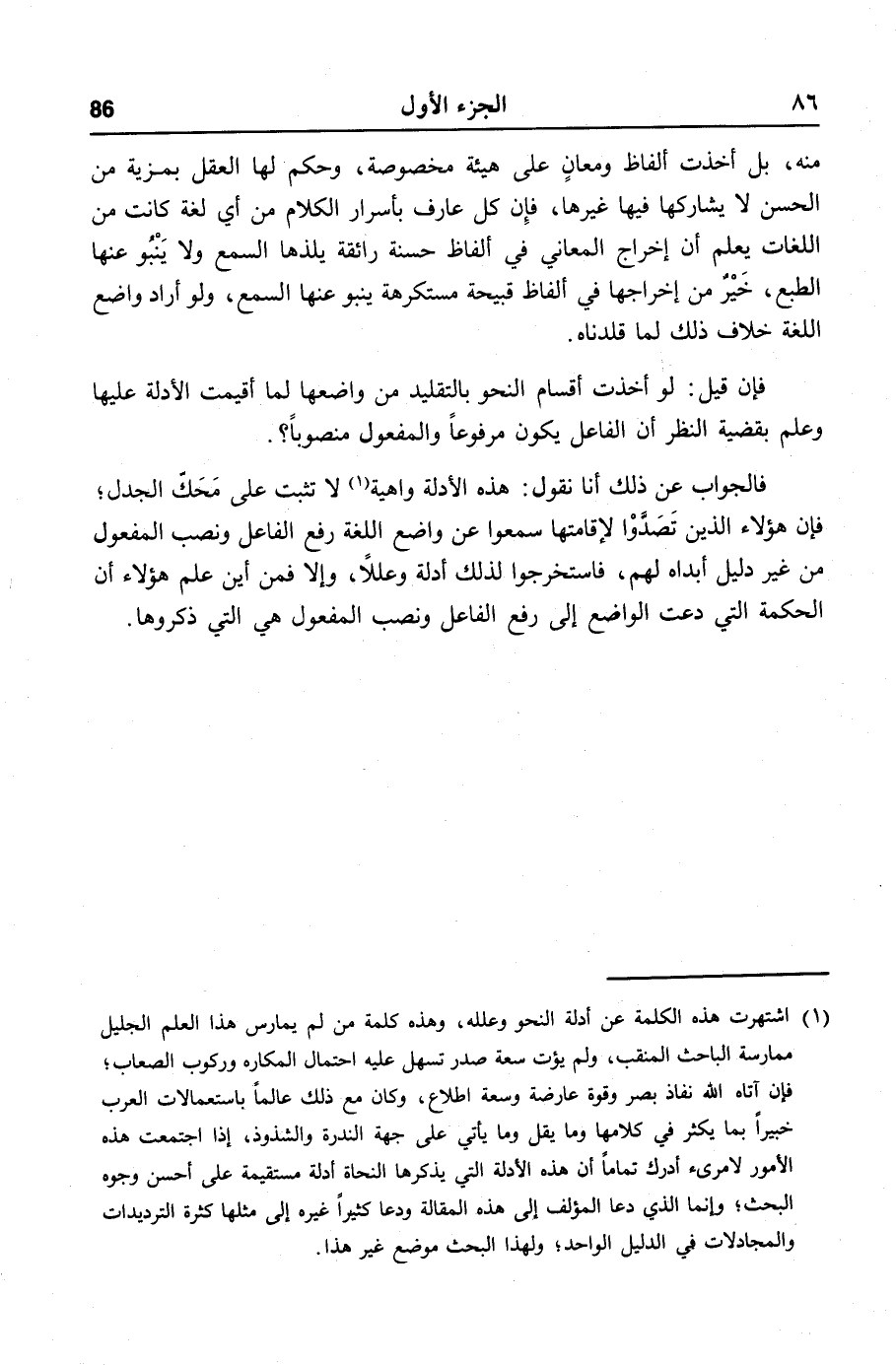 فالجواب عن ذلك أنا نقول: هذه الأدلة واهية «1» لا تثبت على محكّ الجدل؛ فإن هؤلاء الذين تصدّوا لإقامتها سمعوا عن واضع اللغة رفع الفاعل ونصب المفعول من غير دليل أبداه لهم، فاستخرجوا لذلك أدلة وعللا، وإلا فمن أين علم هؤلاء أن الحكمة التي دعت الواضع إلى رفع الفاعل ونصب المفعول هي التي ذكروها.
